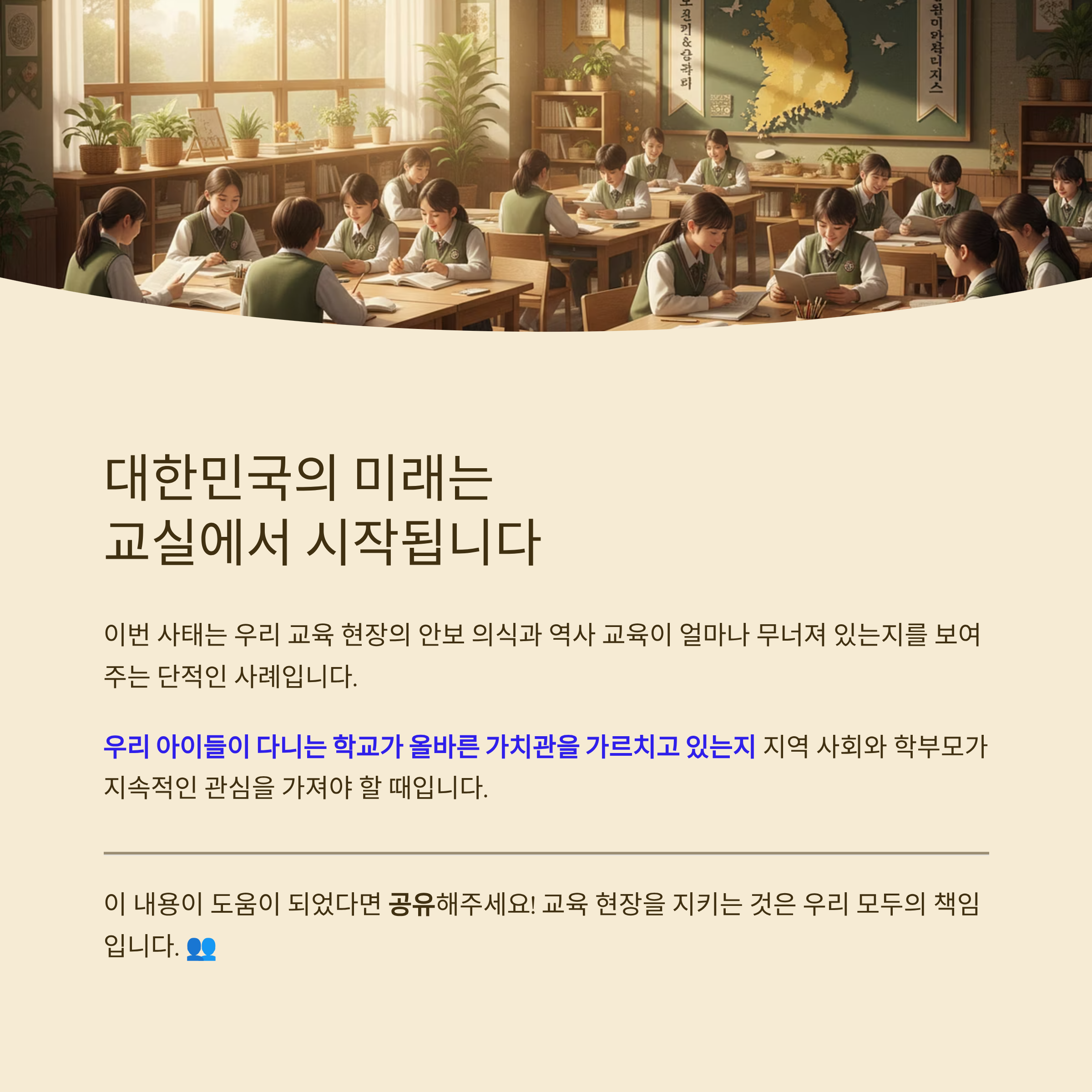 이번 용인 중학교 급훈 사태는 우리 교육 현장의 안보 의식과 역사 교육이 얼마나 무너져 있는지를 보여주는 단적인 사례입니다. '다양성 존중'이나 '학생 자율'이라는 미명 아래, 대한민국의 체제를 위협했던 국가의 국호가 교실 정면에 걸리는 상황은 결코 용납될 수 없습니다. 이는 성장기 청소년들에게 왜곡된 국가관을 심어줄 수 있는 위험한 행위입니다.