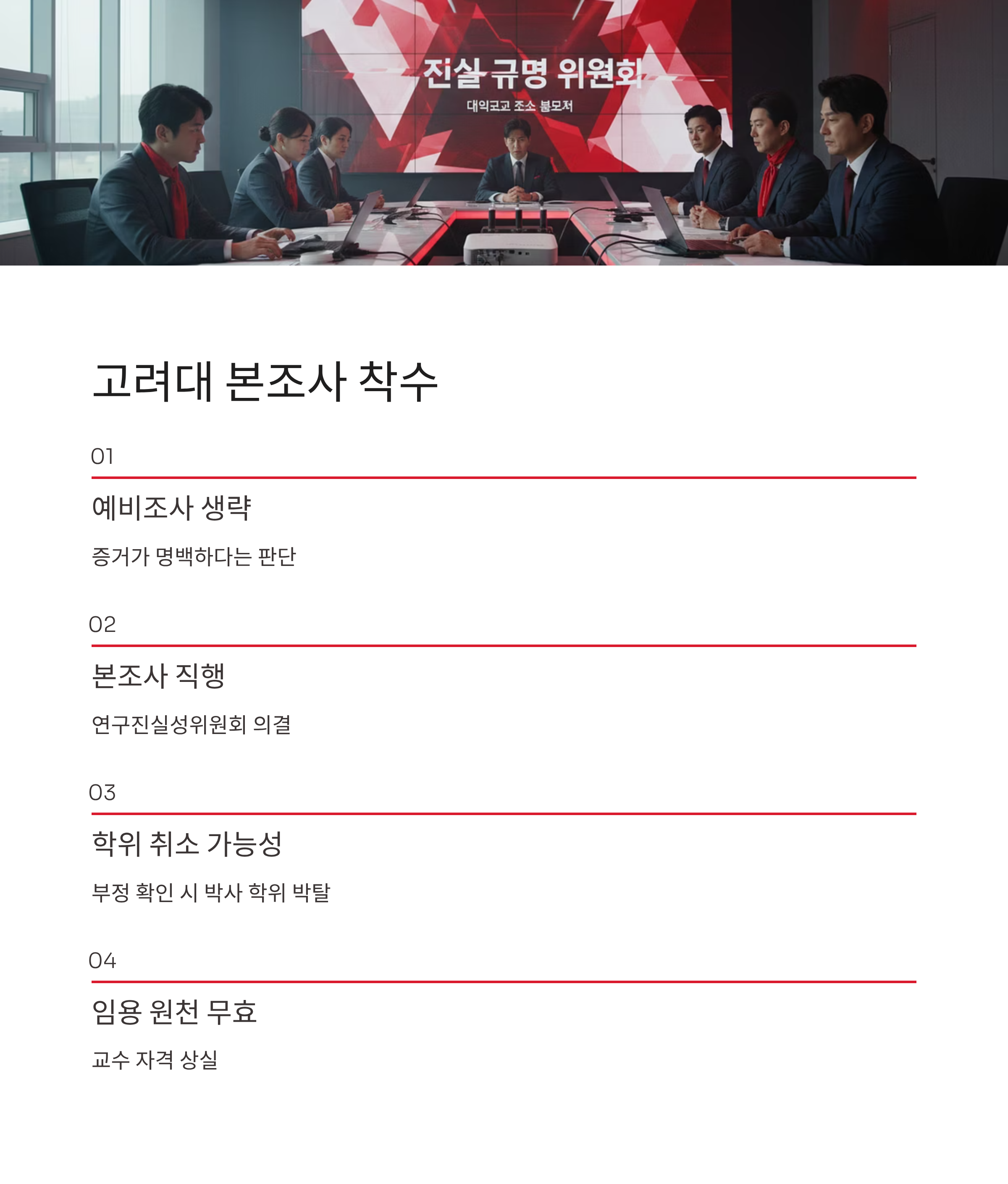 학계의 반응은 매우 단호하고 신속했습니다. 유담 씨의 박사 학위 수여 기관인 고려대학교 연구진실성위원회는 통상적인 절차인 예비조사를 건너뛰고 곧바로 본조사에 착수하기로 의결했습니다. 예비조사는 부정행위 의혹의 사실 여부를 판단하기 위해 본조사 실시 여부를 결정하는 단계입니다. 이 단계를 생략했다는 것은 대학 측이 이미 의혹을 뒷받침할 상당한 증거를 확보했으며, 사안이 매우 중대하고 명백하다고 판단했다는 강력한 신호입니다. 이는 유 씨의 박사 학위 자체가 취소될 수 있는 중대한 위기임을 의미하며, 학위가 취소될 경우 인천대 교수 임용은 원천 무효가 됩니다.