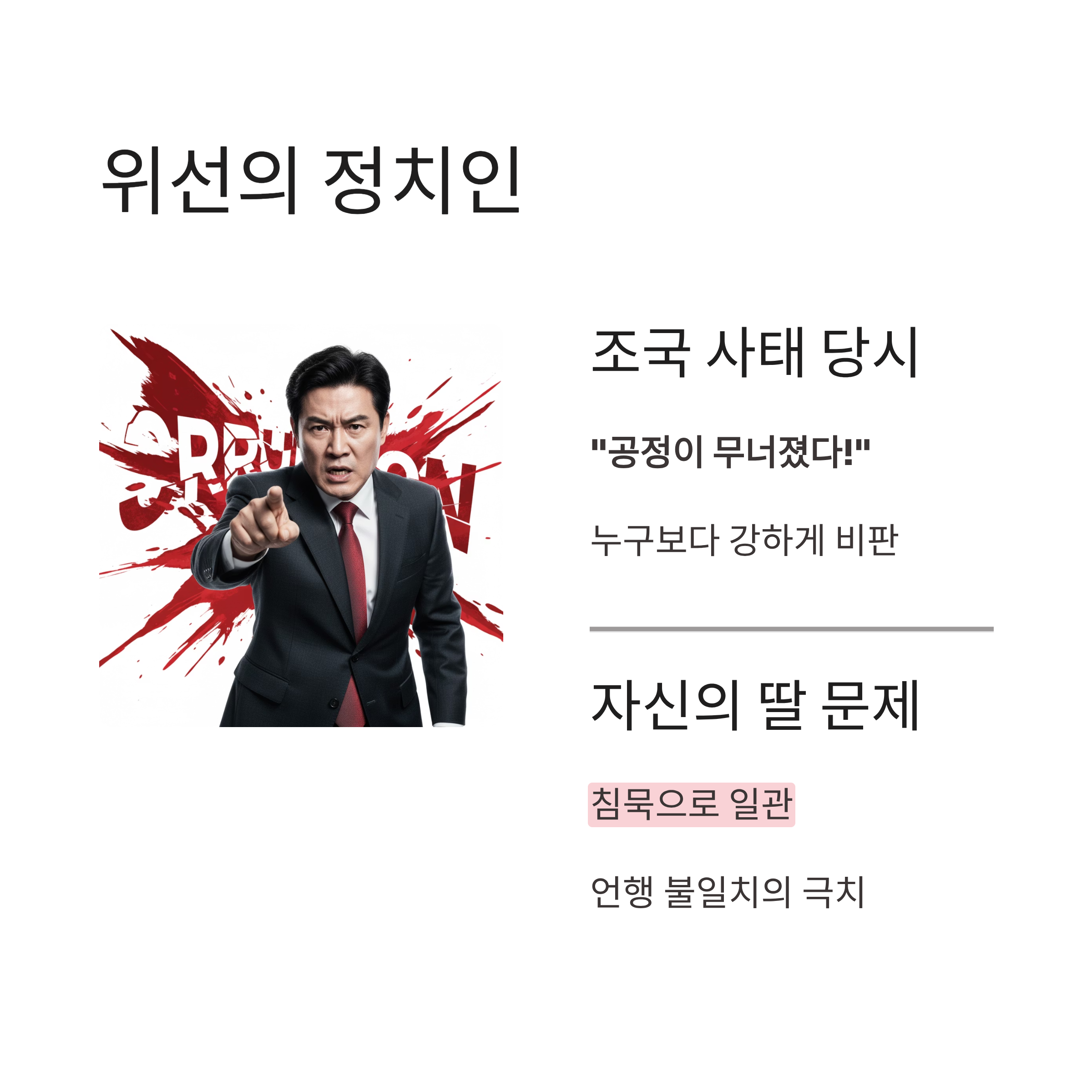 | A: 과거 조국 사태 등에서 누구보다 '공정'의 가치를 강조하며 다른 이들을 비판했지만, 정작 자신의 딸이 더 심각한 특혜 의혹에 휩싸이자 침묵하는 이중적인 태도 때문입니다. 언행 불일치와 위선적인 모습에 대한 국민적 비판이 거셉니다. |