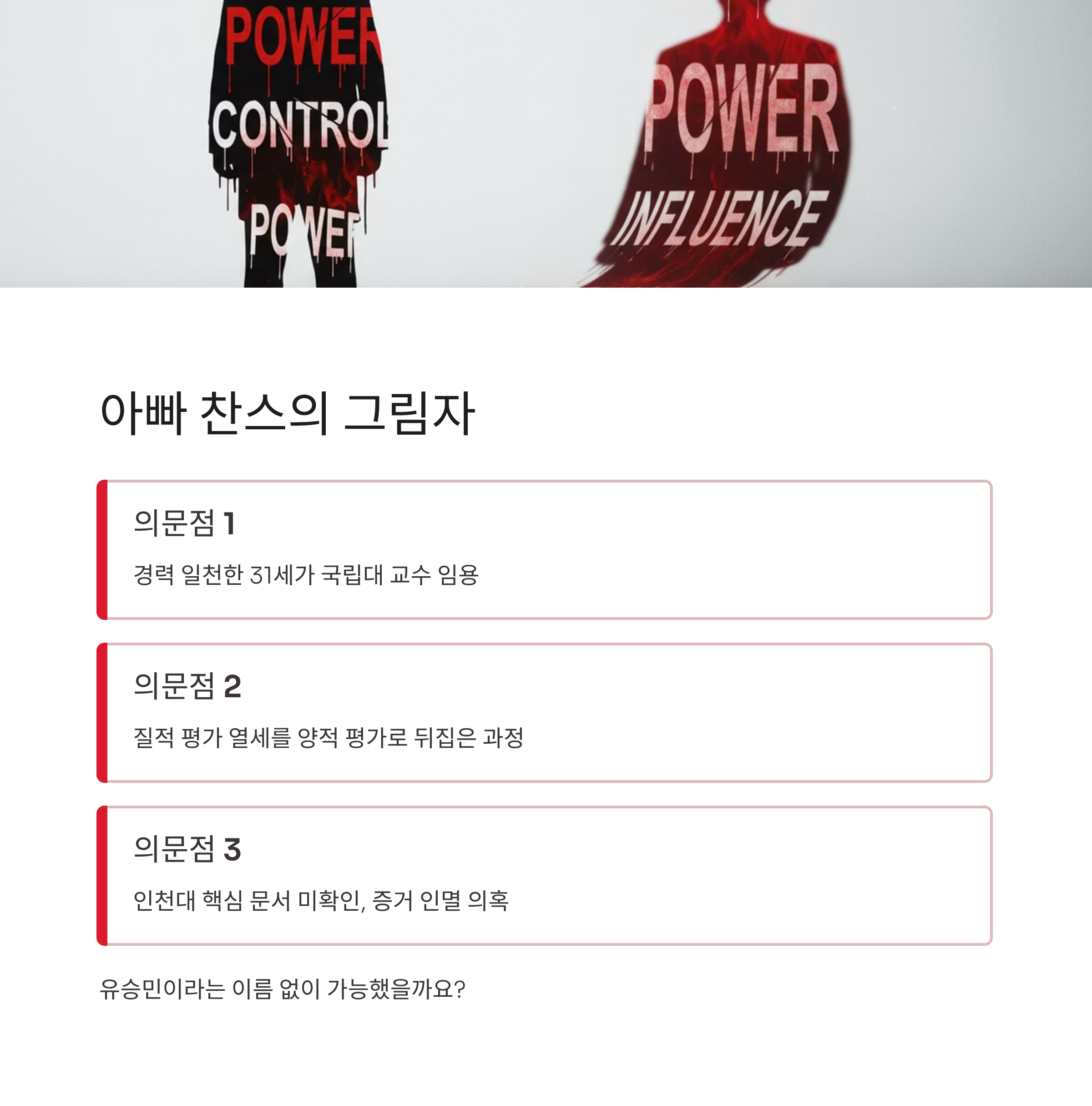 경력도 일천한 31세 사회초년생이 국립대 교수가 되기 위해 마치 짜 맞춘 듯한 시점에 논문을 쏟아내고, 질적 평가의 열세를 양적 평가로 뒤집는 과정이 과연 유승민 전 의원이라는 '아빠 찬스' 없이 가능했을지 국민들은 의심하고 있습니다. 특히 인천대 측에서 채용 관련 핵심 문서들이 확인되지 않는다는 주장이 나오면서, 증거 인멸이나 외부 압력에 대한 의혹은 더욱 커지고 있습니다. 조국 사태 당시 누구보다 '공정'을 외치며 비판의 목소리를 높였던 유승민 전 의원의 이중적인 행태는 국민적 공분을 사기에 충분하며, 이는 단순한 의혹을 넘어 사회적 신뢰를 파괴하는 행위입니다.