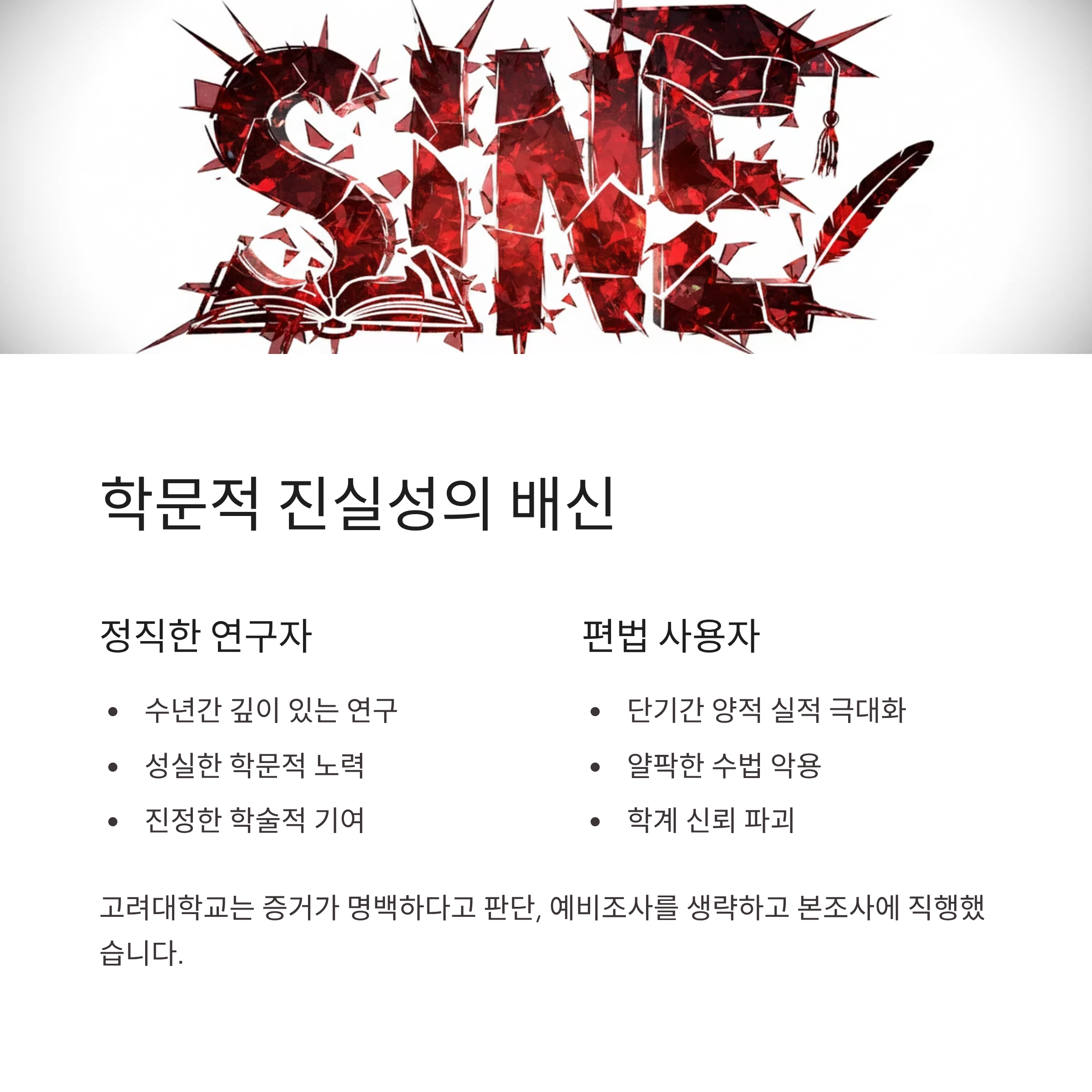 이러한 행위는 학문적 진실성을 근본적으로 훼손하는 배신행위입니다. 교수 임용 심사 과정에서 논문의 질적 수준만큼이나 양적 실적도 중요한 평가 요소로 작용하는 허점을 악용한 것입니다. 유 씨는 이 쪼개기 수법 덕분에 인천대 교수 채용의 '양적 심사'에서 만점을 획득할 수 있었습니다. 이는 정직하게 연구에 매진하는 수많은 박사급 연구 인력과 청년 학자들의 노력을 물거품으로 만드는 행위이며, 학계 전체의 신뢰를 무너뜨리는 심각한 범죄에 가깝습니다. 고려대학교가 증거가 명백하다는 판단하에 예비조사 절차마저 생략하고 본조사로 직행한 것은 이번 사안의 심각성을 방증합니다.