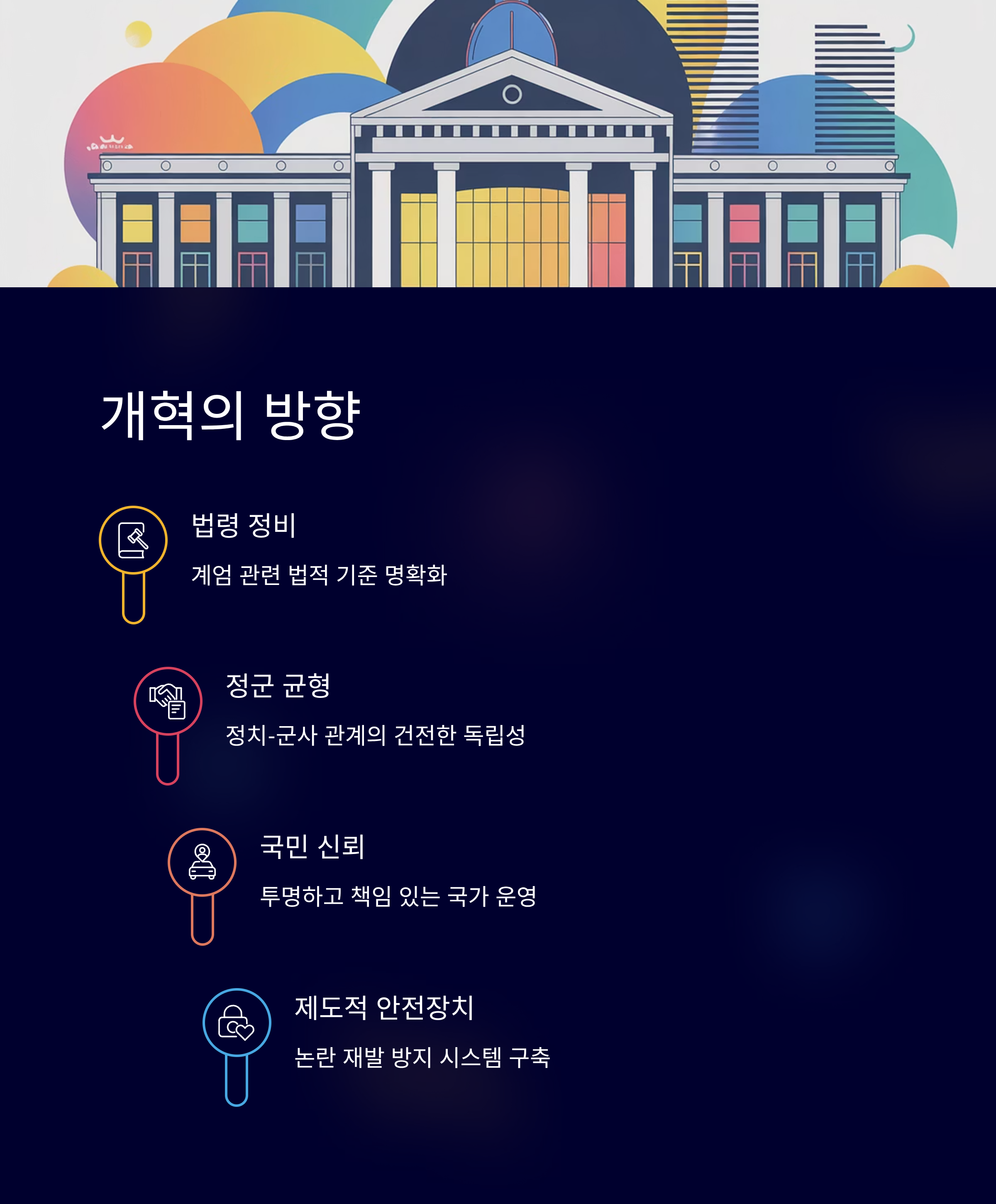 대한민국은 더 이상 권위주의 체제가 아니며, 시민의 눈높이에 맞춘 투명하고 책임 있는 국가 운영이 요구된다. 계엄 논란은 이러한 전환의 과도기에서 발생한 사건으로 해석할 수 있으며, 이 사건을 통해 우리 사회가 얻어야 할 것은 '진실' 뿐만 아니라, 다시는 이런 논란이 반복되지 않도록 하는 제도적 안전장치이다.