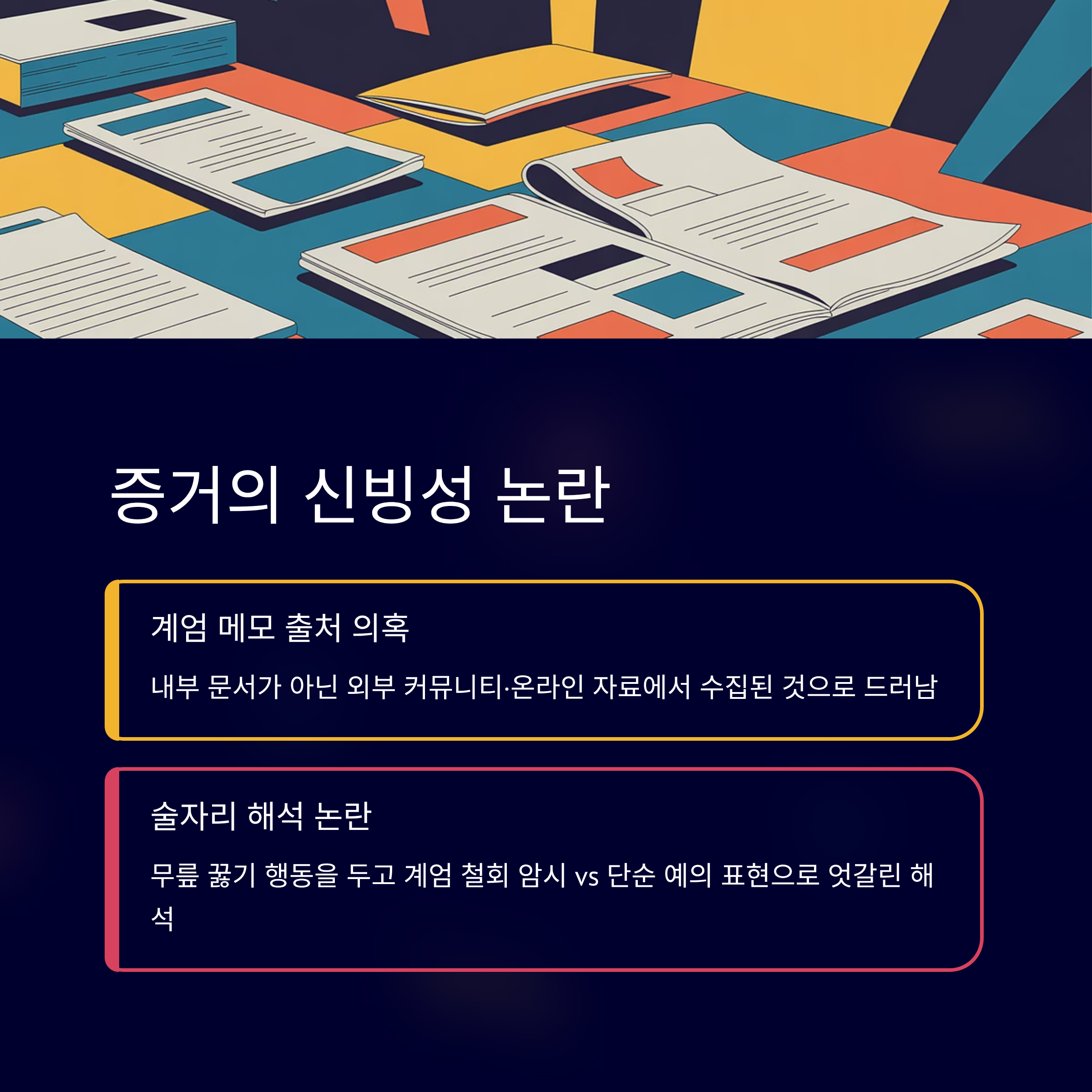 특검이 제출한 증거 중 일부는 신뢰성에 큰 의문이 제기되고 있다. 대표적인 예가 '계엄령 실행 계획'이 담긴 것으로 알려진 메모다. 해당 문건이 내부 작성 문서가 아닌 외부 커뮤니티나 온라인 자료에서 수집된 것임이 드러나면서, 증거로서의 효력이 의심받고 있다.