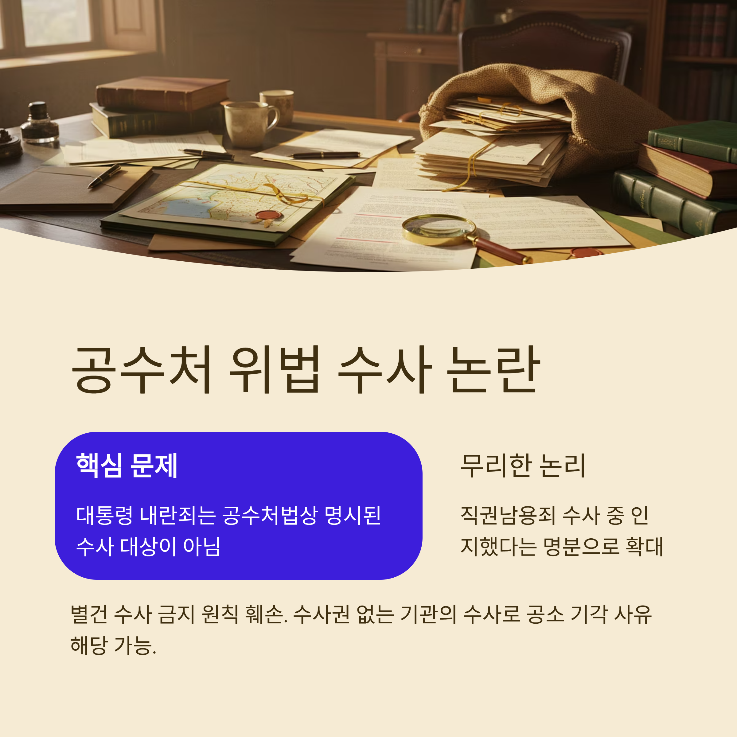 공수처의 수사권 남용 논란: 대통령의 '내란죄'는 공수처법상 명시된 수사 대상이 아니나, 공수처는 직권남용죄 수사 중 인지했다는 논리로 무리하게 기소하여 '공수처 위법수사' 논란의 중심에 섰습니다.