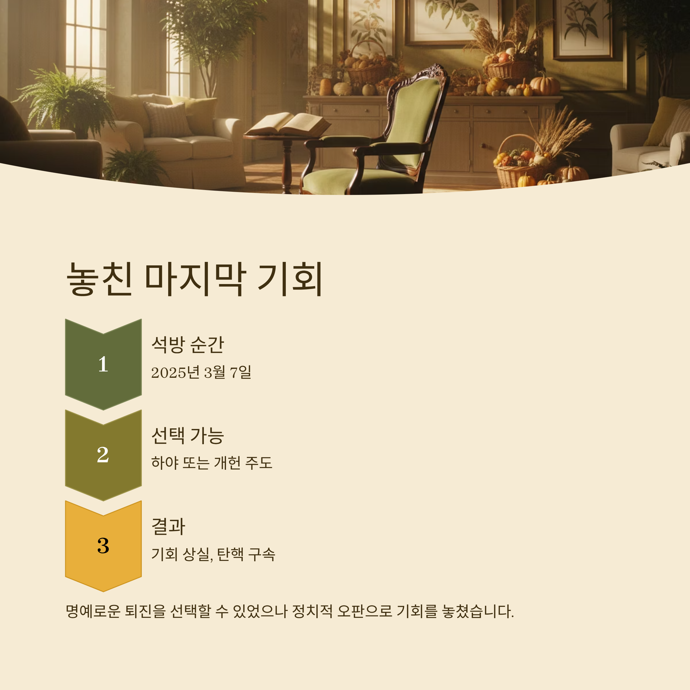 3월 7일의 놓친 마지막 찬스: 직위원 부장판사가 절차적 하자를 이유로 윤 전 대통령을 석방했을 때, 하야 선언 등 정치적 결단을 내렸다면 탄핵과 구속을 피할 수 있었으나 그 기회를 놓쳤습니다.