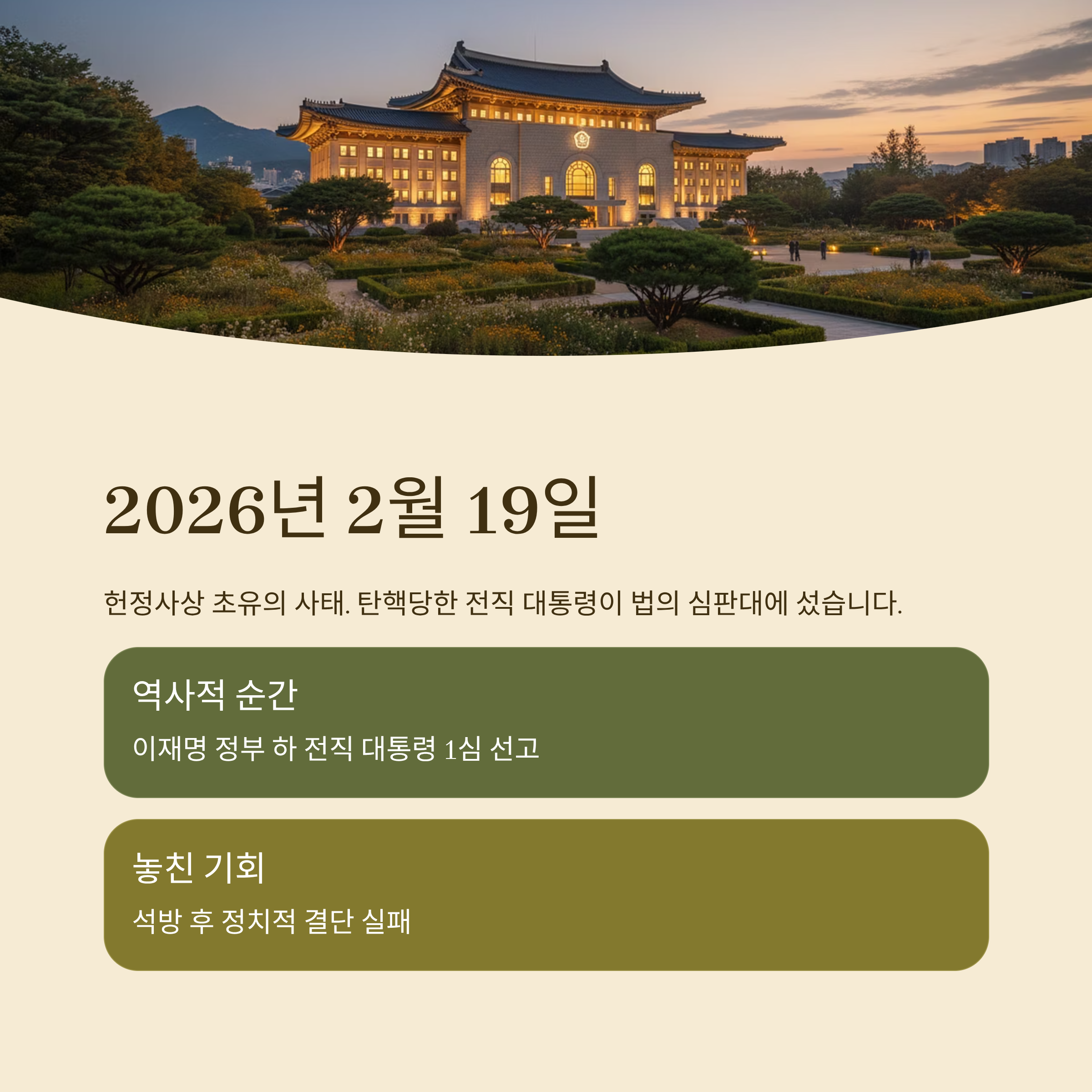 2026년 2월 19일, 대한민국 헌정사상 초유의 사태인 윤석열 전 대통령에 대한 1심 선고가 내려지는 날입니다. 현재 이재명 대통령이 집권하고 있는 상황에서, 탄핵당한 전직 대통령이 법의 심판대에 섰습니다. 본 분석은 과거 직위원 부장판사가 윤 전 대통령에게 주었던 '석방'이라는 마지막 기회와, 이를 살리지 못한 윤 전 대통령의 정치적 오판을 되짚어봅니다. 또한 공수처 수사의 법리적 맹점과 12·3 계엄 선포의 성격, 그리고 달라진 정치 지형 속에서 예상되는 판결의 향방을 심층적으로 다룹니다.