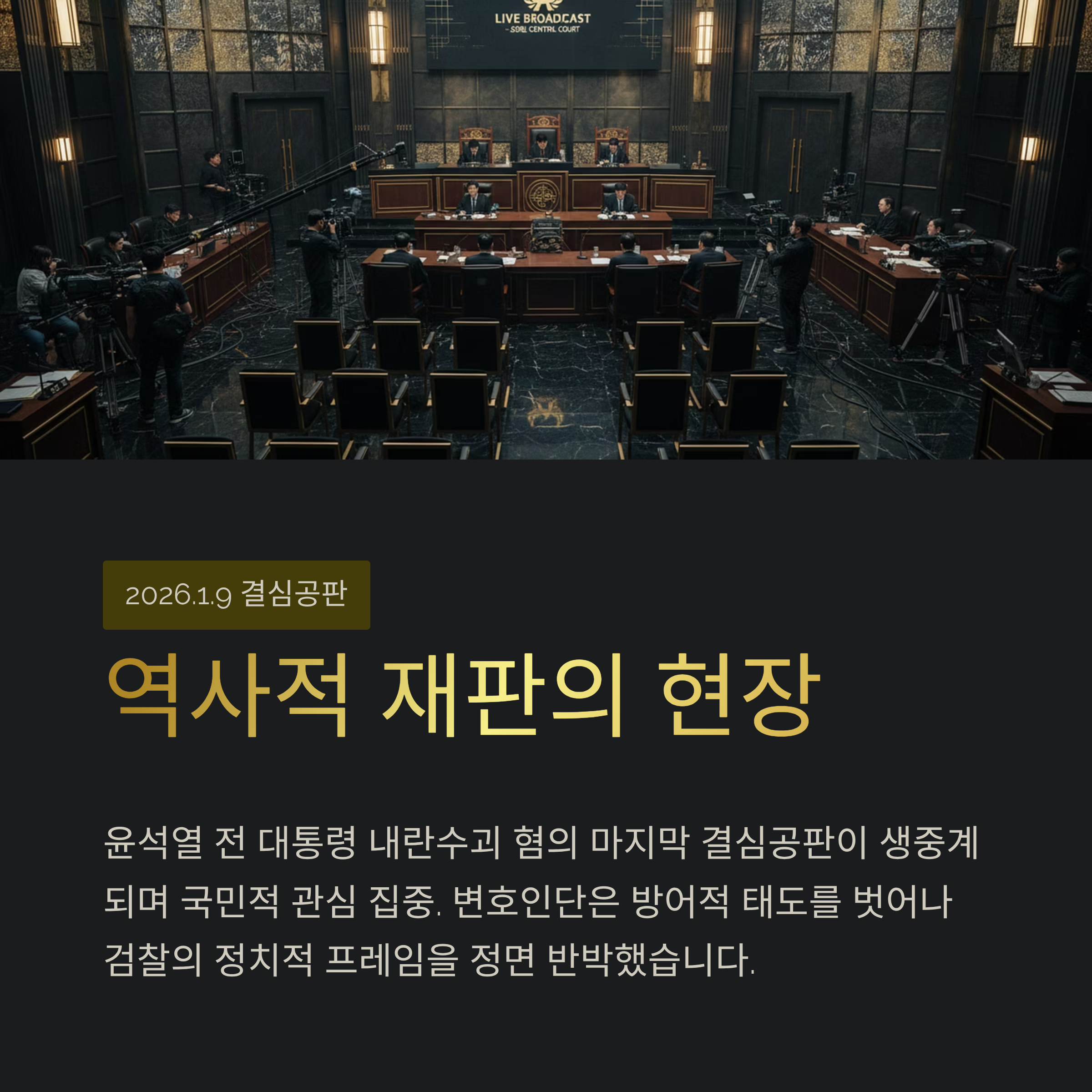 2026년 1월 9일 현재, 윤석열 전 대통령의 내란수괴 혐의와 관련된 마지막 결심 공판이 진행되고 있습니다. 이번 재판은 대한민국 헌정사에서 전직 대통령이 재임 중 선포한 비상계엄과 관련해 내란죄로 법정에 선 위중한 사건입니다. 검찰의 구형이 늦어지며 밤늦은 시간까지 재판이 이어지는 가운데, 변호인단은 충분한 시간을 할애하여 최후 변론을 진행하고 있습니다.