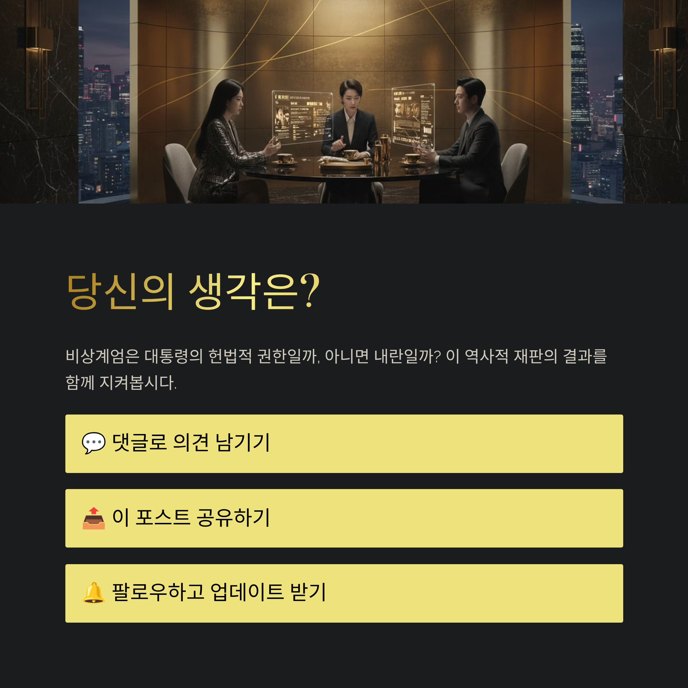 독자 여러분, 이번 재판의 결과는 향후 통치권자의 위기 대처 능력과 헌법 해석에 지대한 영향을 미칠 것입니다. 검찰이 주장하는 '법 앞의 평등'과 변호인단이 주장하는 '통치 행위의 특수성' 사이에서 재판부는 고뇌할 수밖에 없습니다. 부디 이번 판결이 정치적 유불리를 떠나 헌법 정신과 법치주의를 바로 세우는 계기가 되기를 바라며, 국민 모두가 냉철한 시각으로 사법부의 최종 판단을 지켜봐야 할 것입니다.