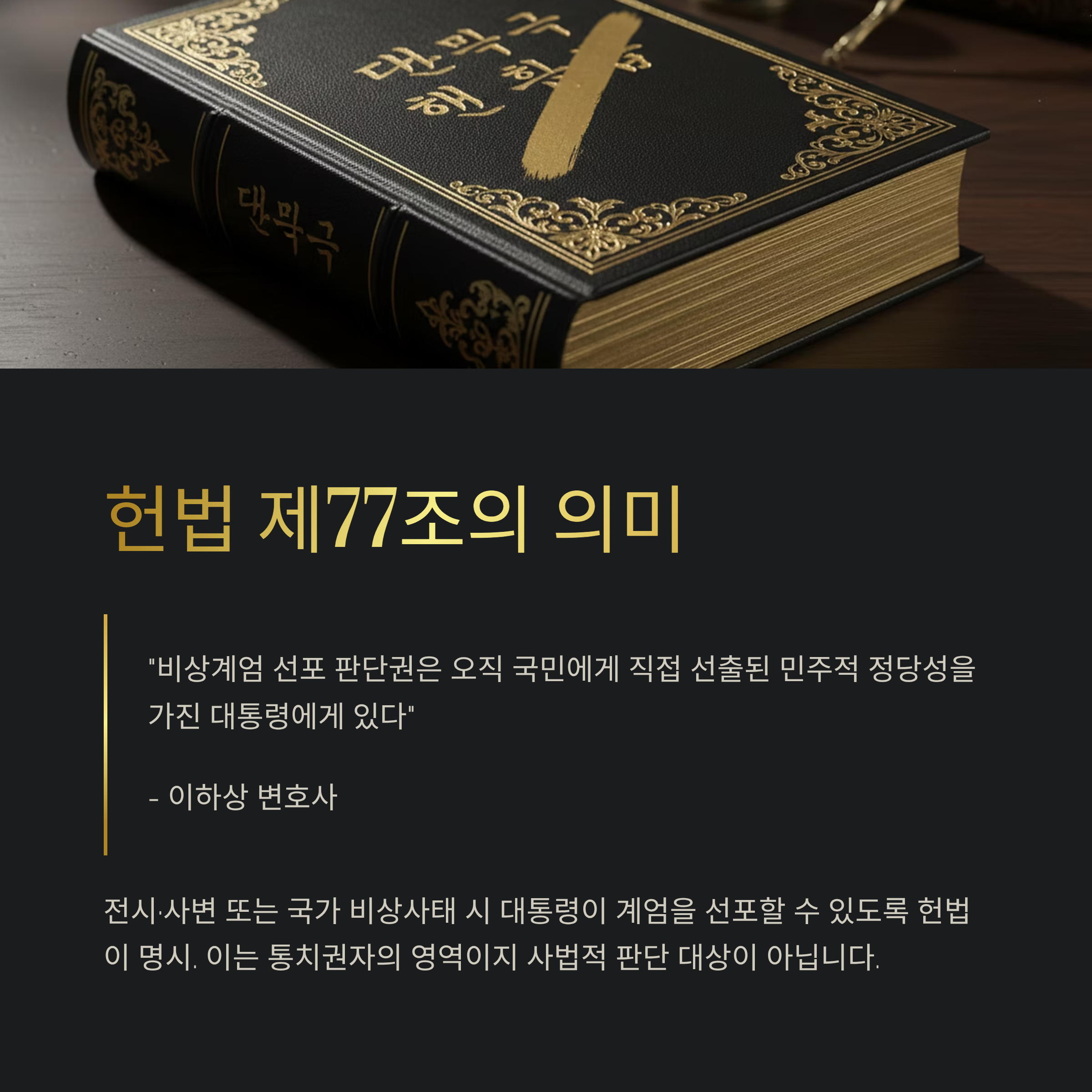 변호인단은 이번 사건의 핵심을 검찰이 대통령의 헌법상 권한을 침해한 것으로 보고 있습니다. 헌법 제77조는 전시·사변 또는 이에 준하는 국가 비상사태에 있어서 병력으로써 군사상의 필요에 응하거나 공공의 안녕질서를 유지할 필요가 있을 때 대통령이 계엄을 선포할 수 있도록 규정하고 있습니다. 이하상 변호사는 "비상계엄 선포에 대한 판단권은 오직 국민에게 직접 선출된 민주적 정당성을 가진 대통령에게 있다"고 강조했습니다. 즉, 국가 위기 상황을 인지하고 결단을 내리는 것은 통치권자의 영역이지, 사법적 잣대로 재단할 검사의 영역이 아니라는 것입니다.
