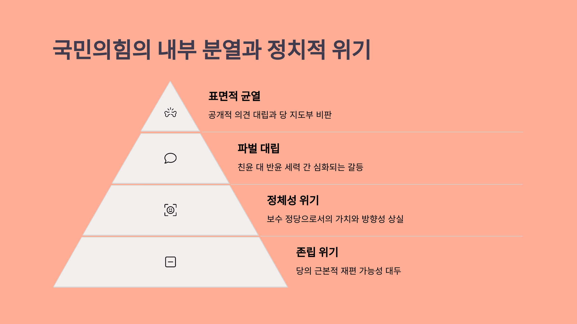 - 국민의힘은 내부 단속 실패와 지도부 책임론으로 지지층 이탈 조짐을 보이고 있음.
