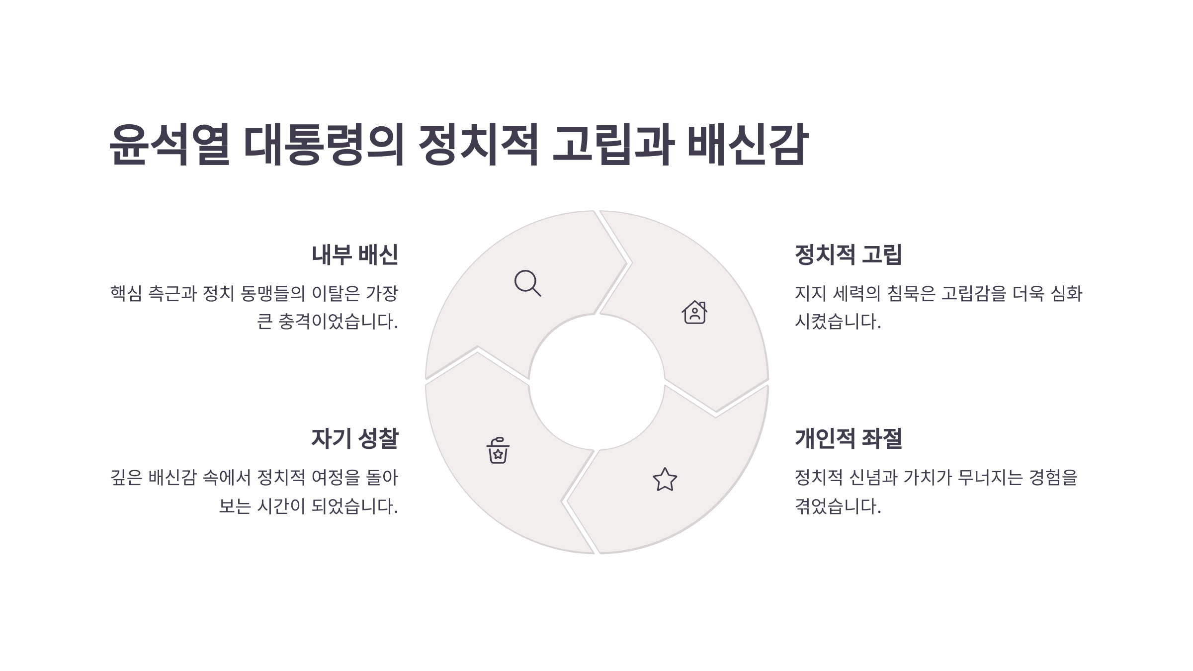 - 윤 대통령은 내부 정치인들과 재판관들에게 깊은 배신감을 느끼며 충성에 대한 절망을 언급함.
