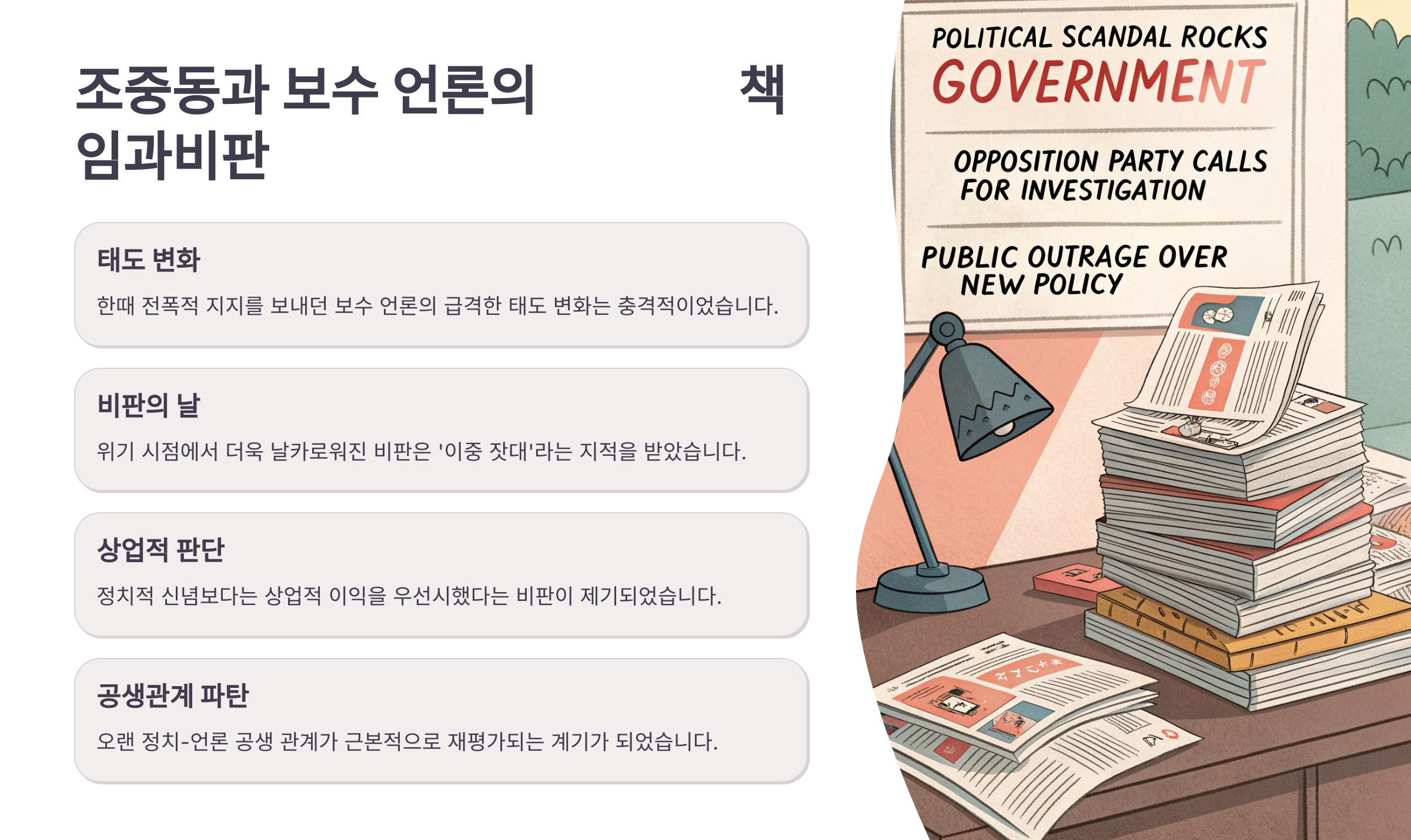 보수 진영의 대표 언론으로 불리던 조중동이 이번 사태에 대해 명확한 입장을 보이지 않거나, 오히려 비판적인 논조를 유지한 데 대한 반발이 큽니다. “기존 권력과 결탁해 생존을 모색한 것”이라는 비판까지 제기되고 있습니다.