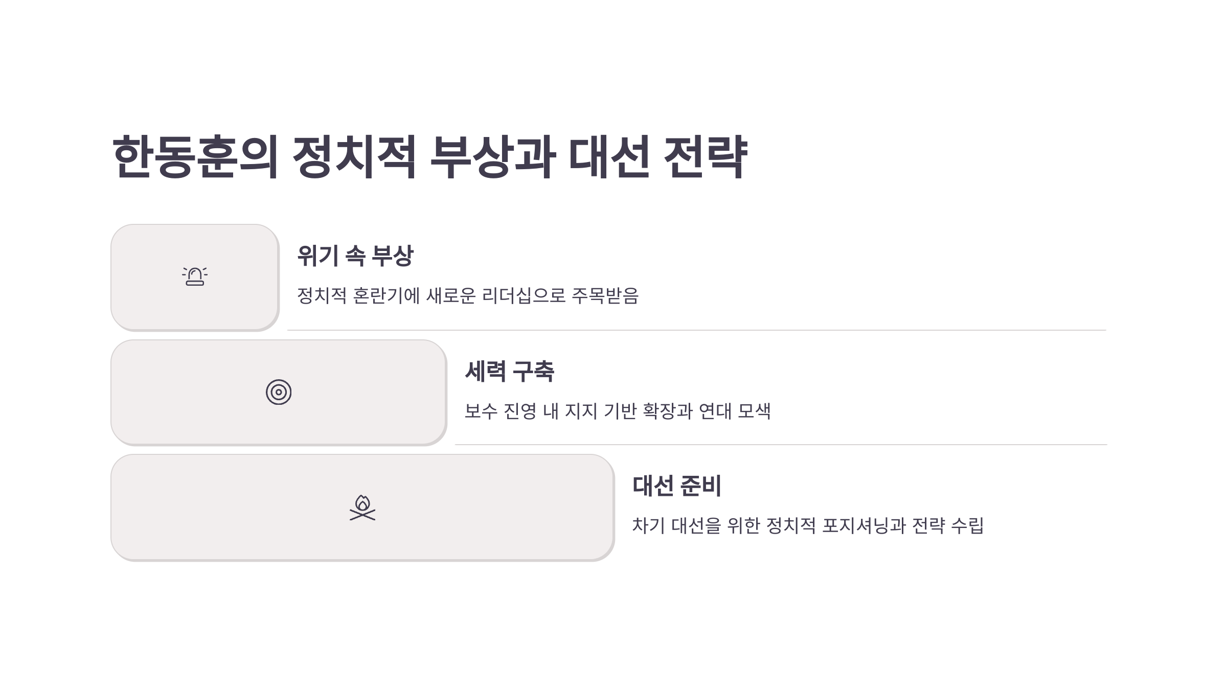 - 한동훈 전 장관은 탄핵 과정에서 중심 인물로 부각되며, 대선 출마 선언으로 정계 재편을 촉발함.