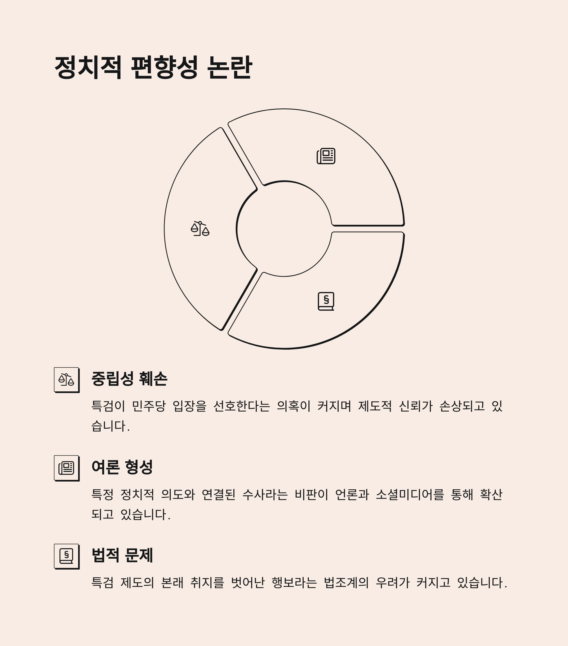 특검 제도의 기초는 정치적 중립성을 바탕으로 하는데, 주요 인물 중심의 수사가 특정 정당의 정치적 의도와 연결되는 경우 이는 제도적 신뢰성을 손상시킵니다. 전문가들은 이러한 논란이 특검이 수행해야 할 본래의 목적과 취지를 벗어난 행보로 이어지고 있는 점을 우려하고 있습니다.