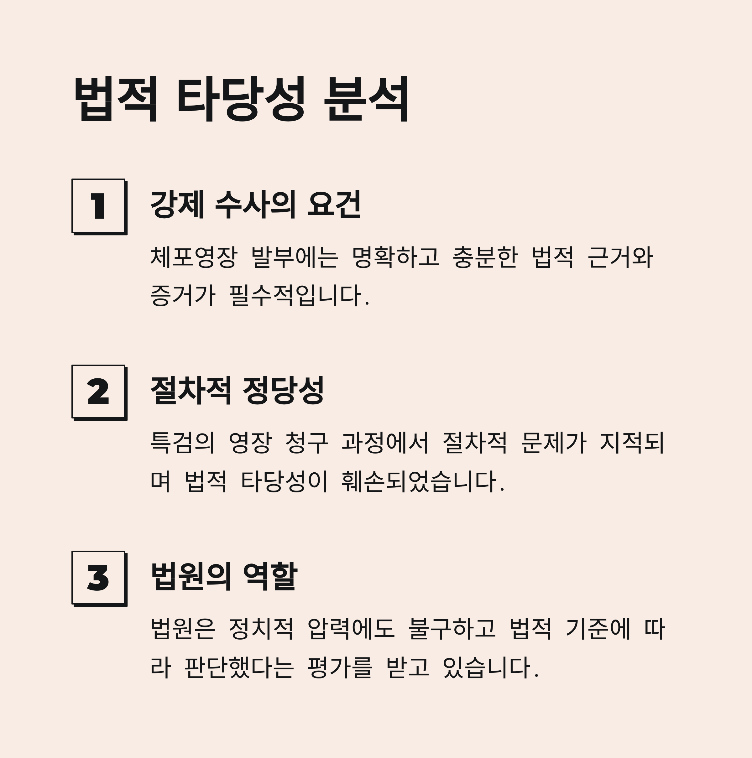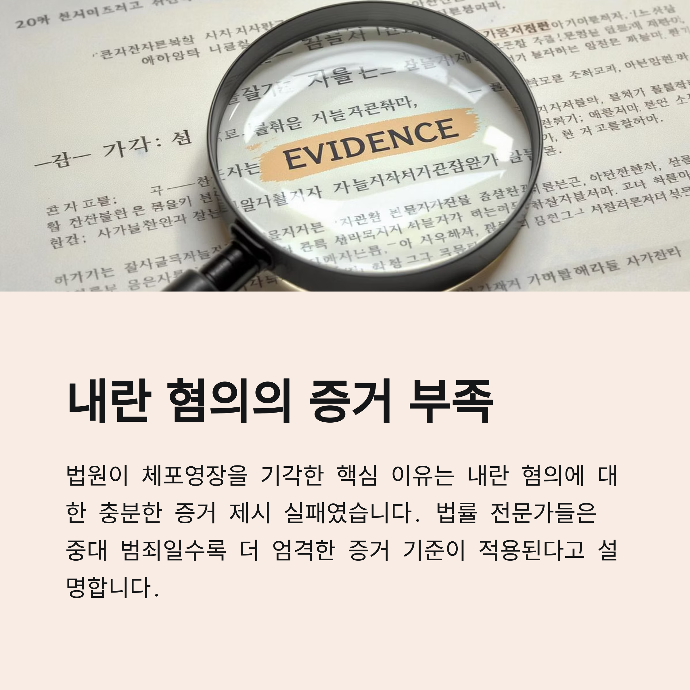 윤석열 전 대통령에 대한 체포영장의 기각은 법률적 관점에서 강제 수사의 타당성이 부족했음을 시사합니다. 특히 특검이 내란 혐의와 관련된 충분한 증거를 제시하지 못했다는 점이 주요 논점이 되었습니다. 이는 법원이 강조한 적법한 절차와 증거의 명확성을 요구하는 기조에 부합합니다.