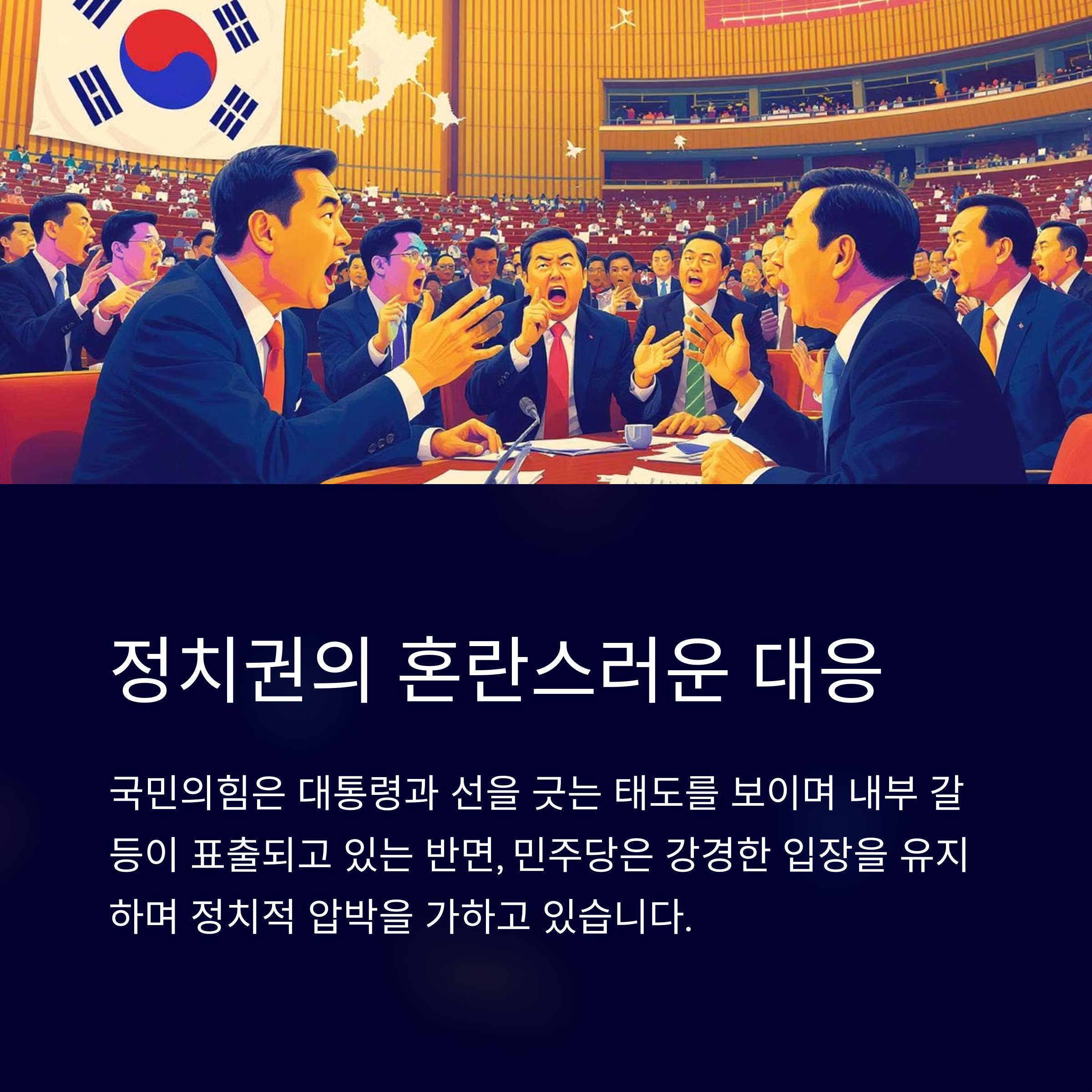 3. 국민의힘은 대통령과 선을 긋는 태도를 보인 반면, 민주당은 강경한 입장을 유지하고 있습니다.