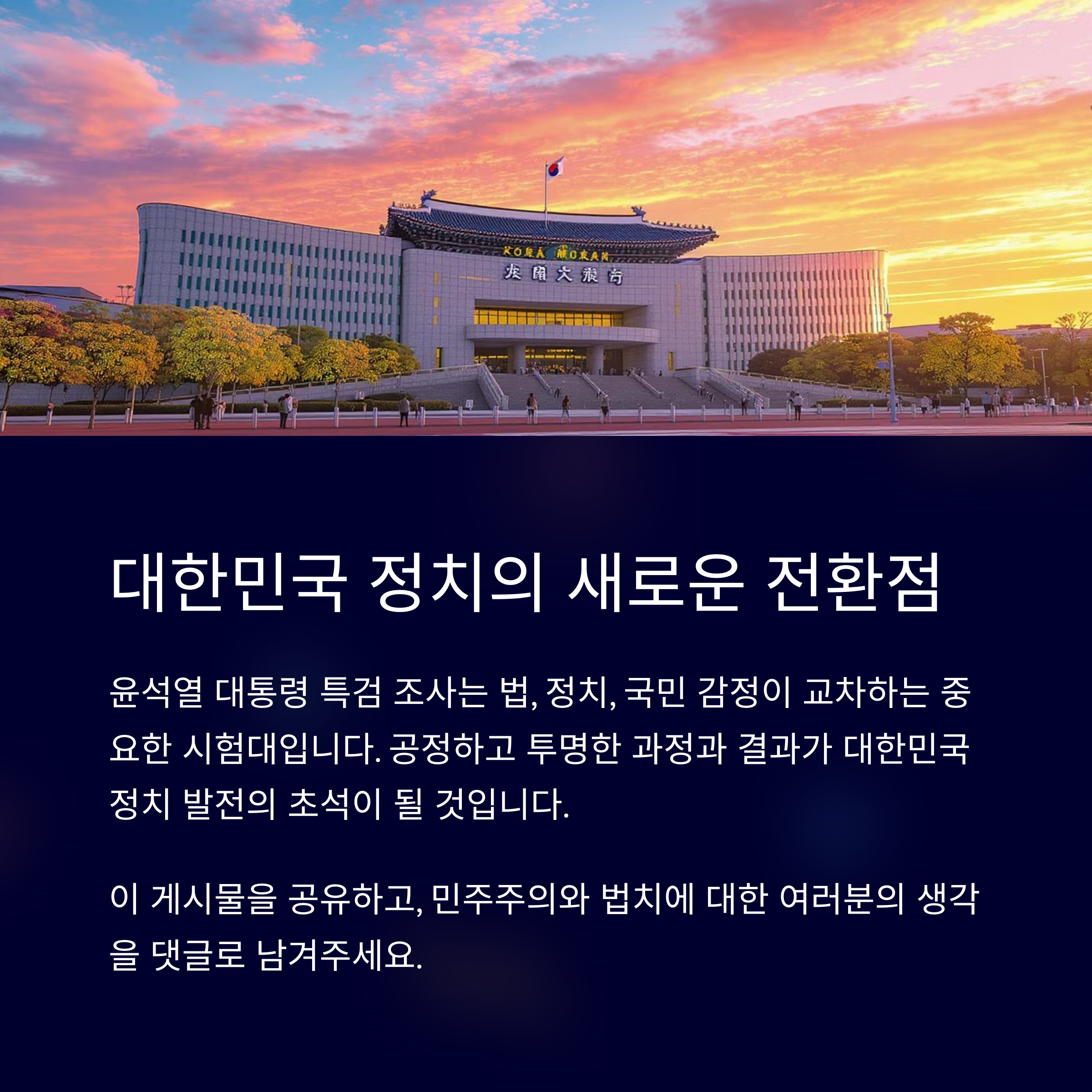 윤석열 대통령의 특검 조사는 법, 정치, 국민 감정이 교차하는 중요한 시험대가 되고 있습니다. 이번 사안을 통해 정부의 투명성과 사회적 신뢰가 다시 한 번 시험받고 있으며, 국민들이 원하는 답은 공정하고 명확한 결과입니다. 정치권, 법조계, 국민 모두의 관심이 집중된 이번 사건은 앞으로 대한민국이 나아갈 방향성에도 중대한 영향을 미칠 것입니다. 신중한 검토와 성숙한 대응만이 사회적 혼란을 줄이고, 민주 국가로서의 명성을 지킬 수 있는 열쇠가 될 것입니다.