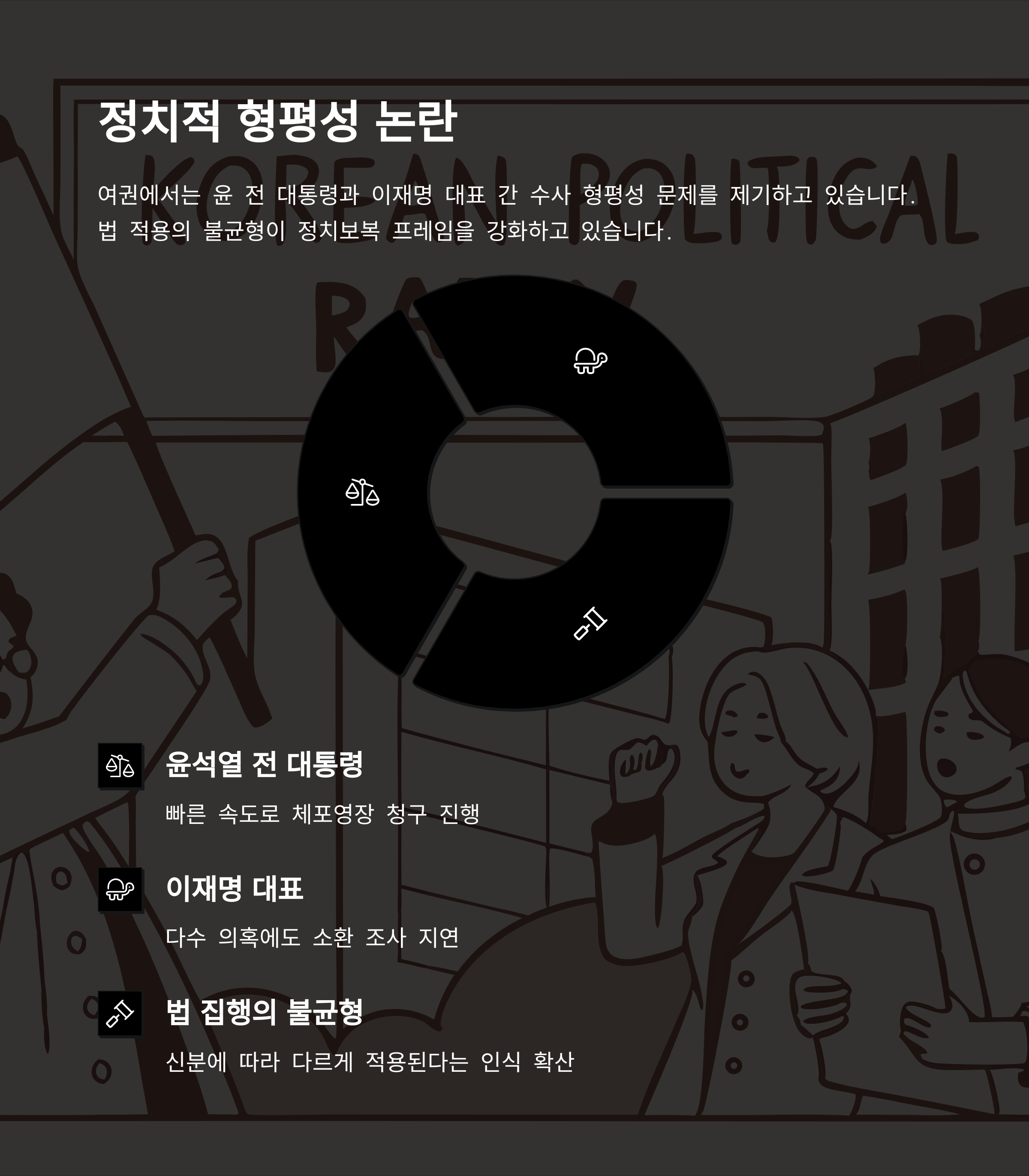 윤석열 전 대통령에 대한 수사가 ‘내란 혐의’에서 ‘특수 공무집행 방해’로 변경되며 다소 수위가 낮아졌지만, 이를 둘러싼 정치적 해석은 여전합니다. 특히 여권 일각에서는 “이재명 대표는 수차례 의혹에도 불구하고 단 한 차례 소환도 없었다”는 점을 들어 ‘정치적 형평성’을 문제 삼고 있습니다. 법이 신분에 따라 다르게 적용된다는 인식은 사법부에 대한 국민 신뢰를 흔드는 심각한 이슈입니다.