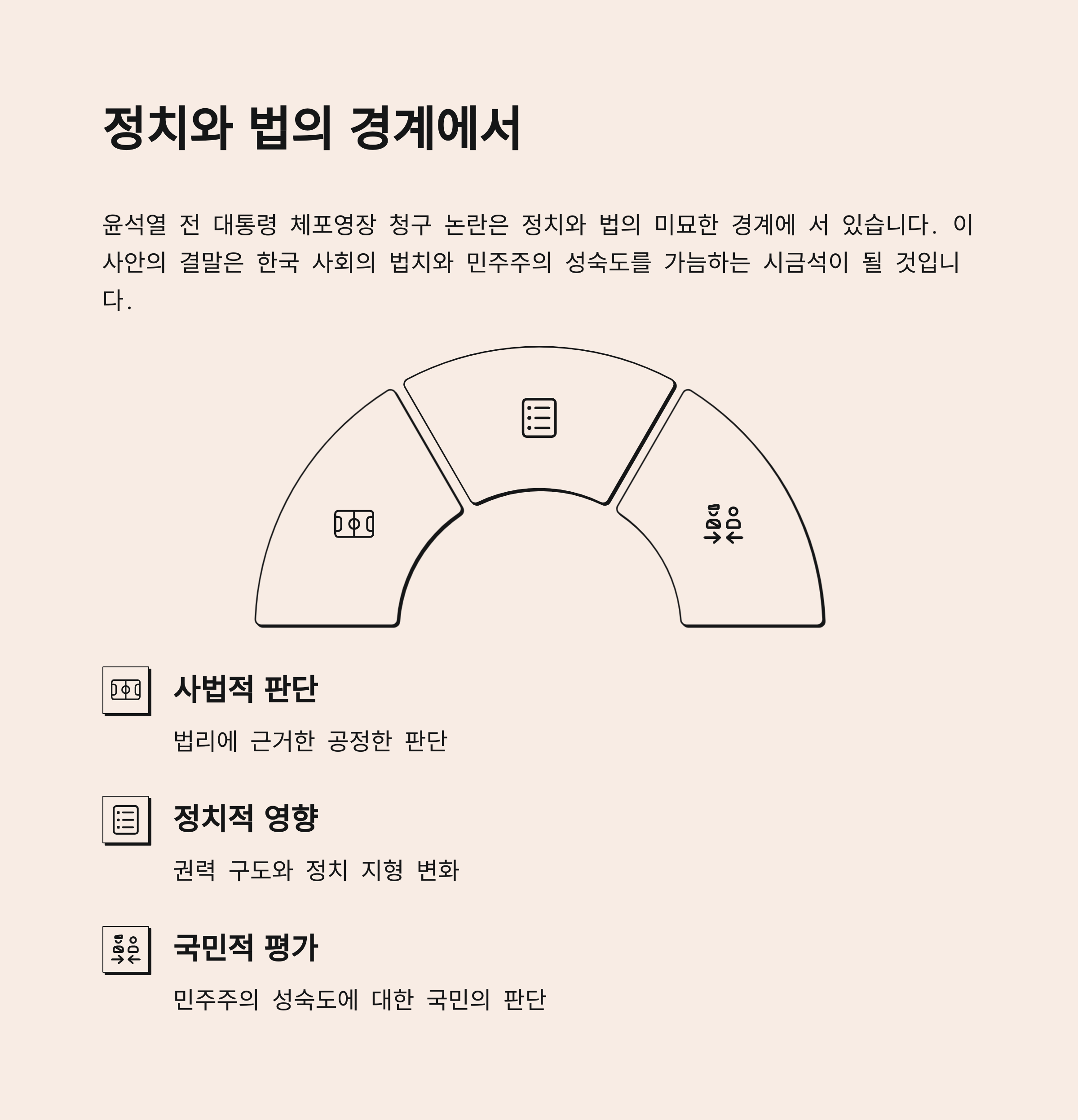 윤석열 전 대통령에 대한 체포영장 청구는 단순한 수사 절차를 넘어, 대한민국 정치와 법치주의의 작동 방식에 깊은 의문을 던지고 있습니다. 정당한 소환에는 응할 의사가 있다는 윤 전 대통령 측의 주장과, 법 앞의 평등을 강조하는 특검의 입장은 정면으로 충돌하며, 국민들에게는 ‘공정한 수사란 무엇인가’에 대한 질문을 남깁니다.