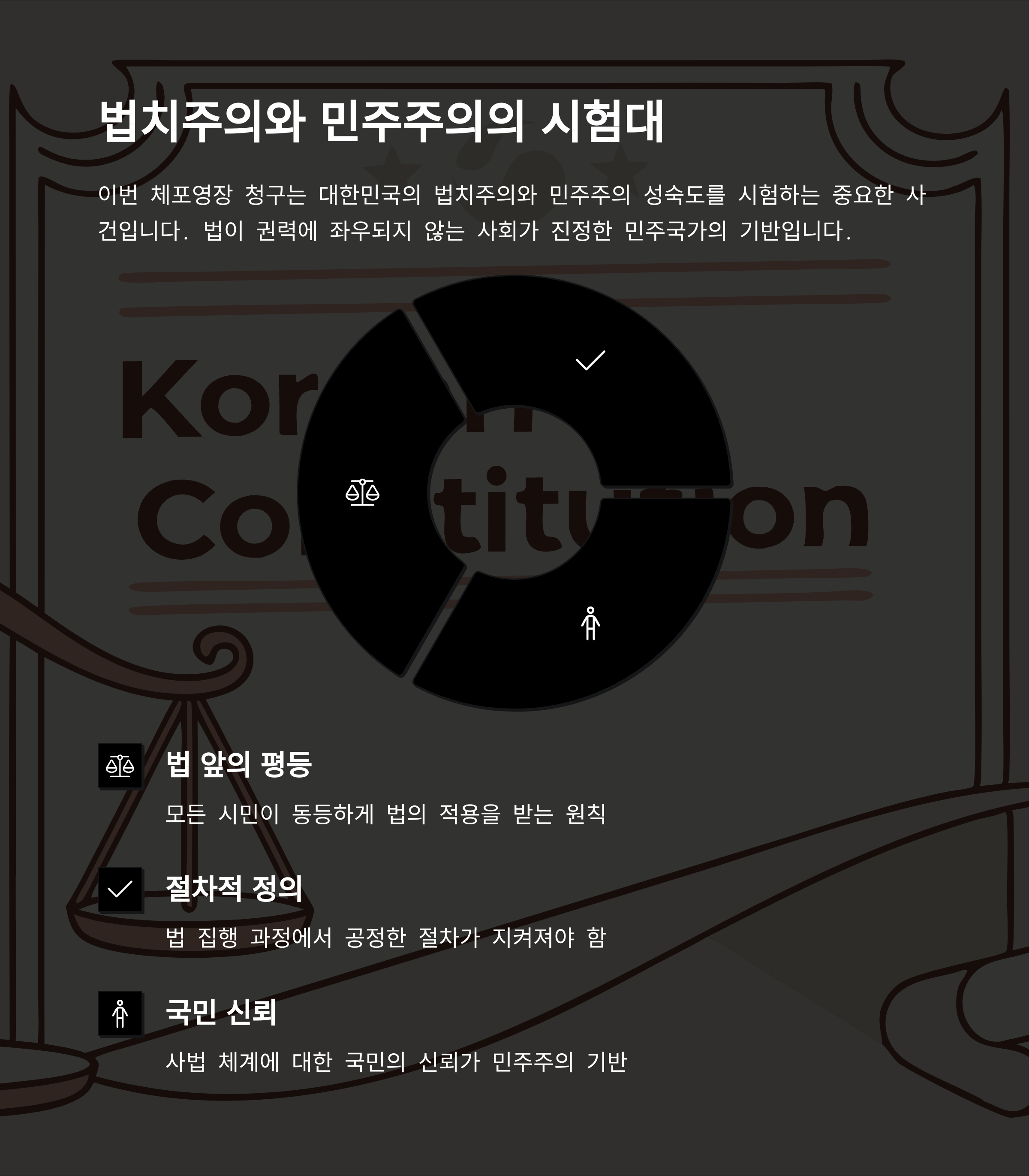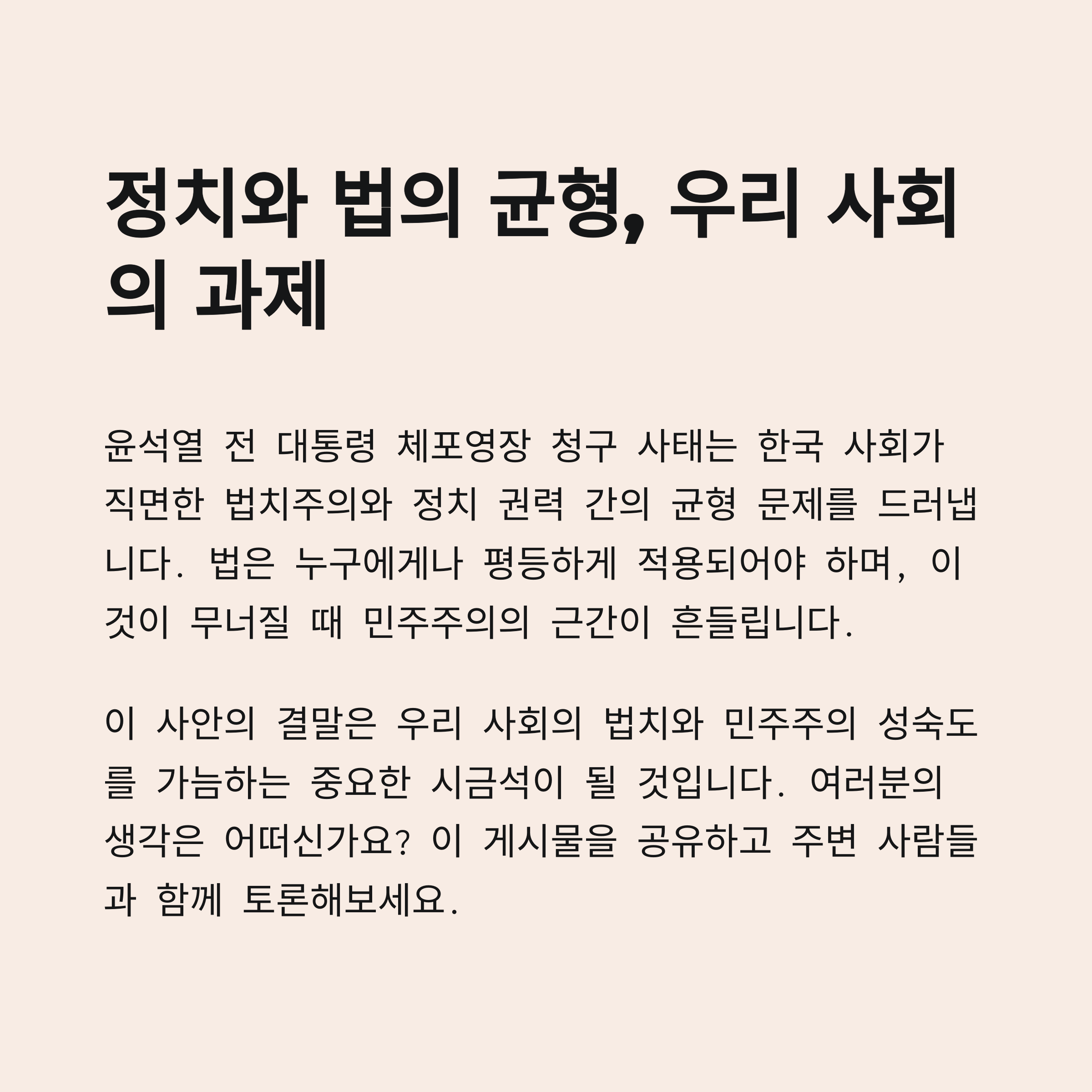 법은 누구에게나 평등하게 적용되어야 한다는 원칙이 무너질 때, 그 사회는 법이 아닌 권력이 지배하게 됩니다. 윤석열 전 대통령 체포영장 청구 논란은 그러한 경계에 선 위기의 순간입니다. 향후 이 사안이 어떤 결말을 맞이할지에 따라, 한국 사회의 법치와 민주주의의 성숙도도 함께 평가받게 될 것입니다.
