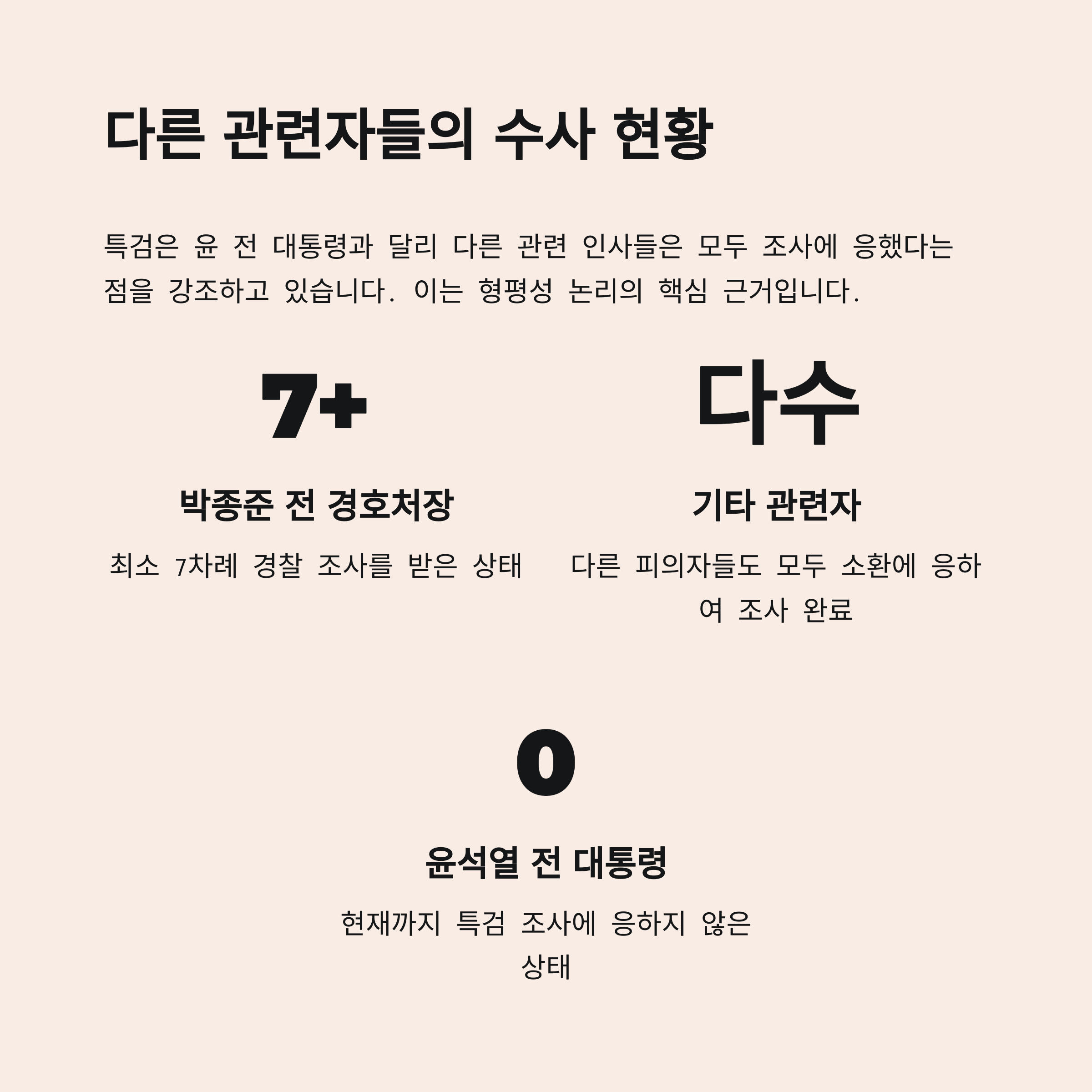 조은석 특검은 윤석열 전 대통령이 수사에 불응한 유일한 피의자이며, 다른 관련 인사들은 모두 다수 차례 조사를 받았다는 점을 강조합니다. 박종준 전 경호처장 등은 이미 최소 7차례 경찰 조사를 받은 바 있으며, 이에 비해 윤 전 대통령의 침묵은 수사 방해에 해당된다는 것이 특검의 시각입니다. 특검은 “법은 누구에게나 평등하게 적용돼야 한다”는 원칙을 내세우며 영장 청구의 정당성을 부각시키고 있습니다.