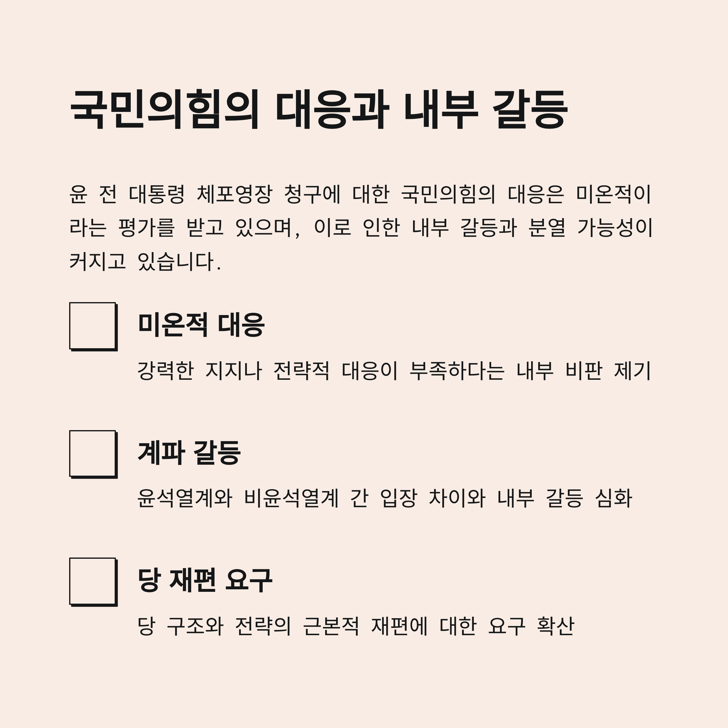 특히 이번 사태는 단지 한 정치인의 법적 책임 문제를 넘어, 정치 세력 간의 힘겨루기와 권력의 흐름 변화까지 드러내고 있다는 점에서 주목할 만합니다. 국민의힘의 미온적 대응과 내부 분열은 윤 전 대통령에 대한 지지를 유지할 수 있을지 여부를 시험대에 올려놓고 있으며, 보수진영 내부의 재편 가능성도 높아지고 있습니다.
