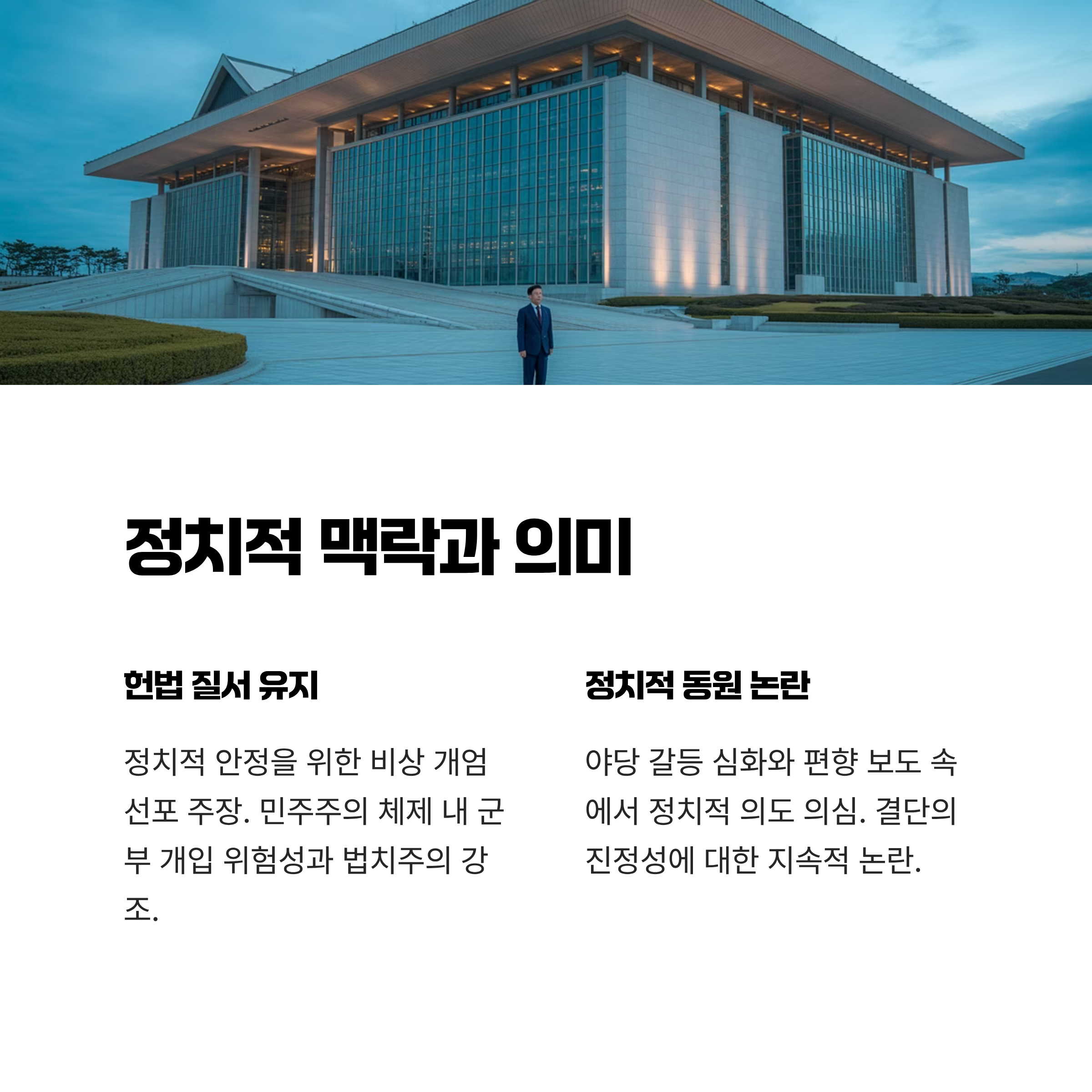 윤석열 전 대통령의 발언에서 주목할 부분은 정치적 안정과 헌법 질서 유지를 위해 비상 개엄을 선포했다고 밝힌 점입니다. 그의 주장은 단순히 현 상황 경고를 넘어, 구체적인 정치적 행위의 방향성을 제시하는 선례로 이해됩니다. 이는 민주주의 체제 내에서 군부 개입의 위험성과 함께, 법치주의를 강조하는 대한민국 헌법 정신과의 긴장 관계를 드러냈습니다.