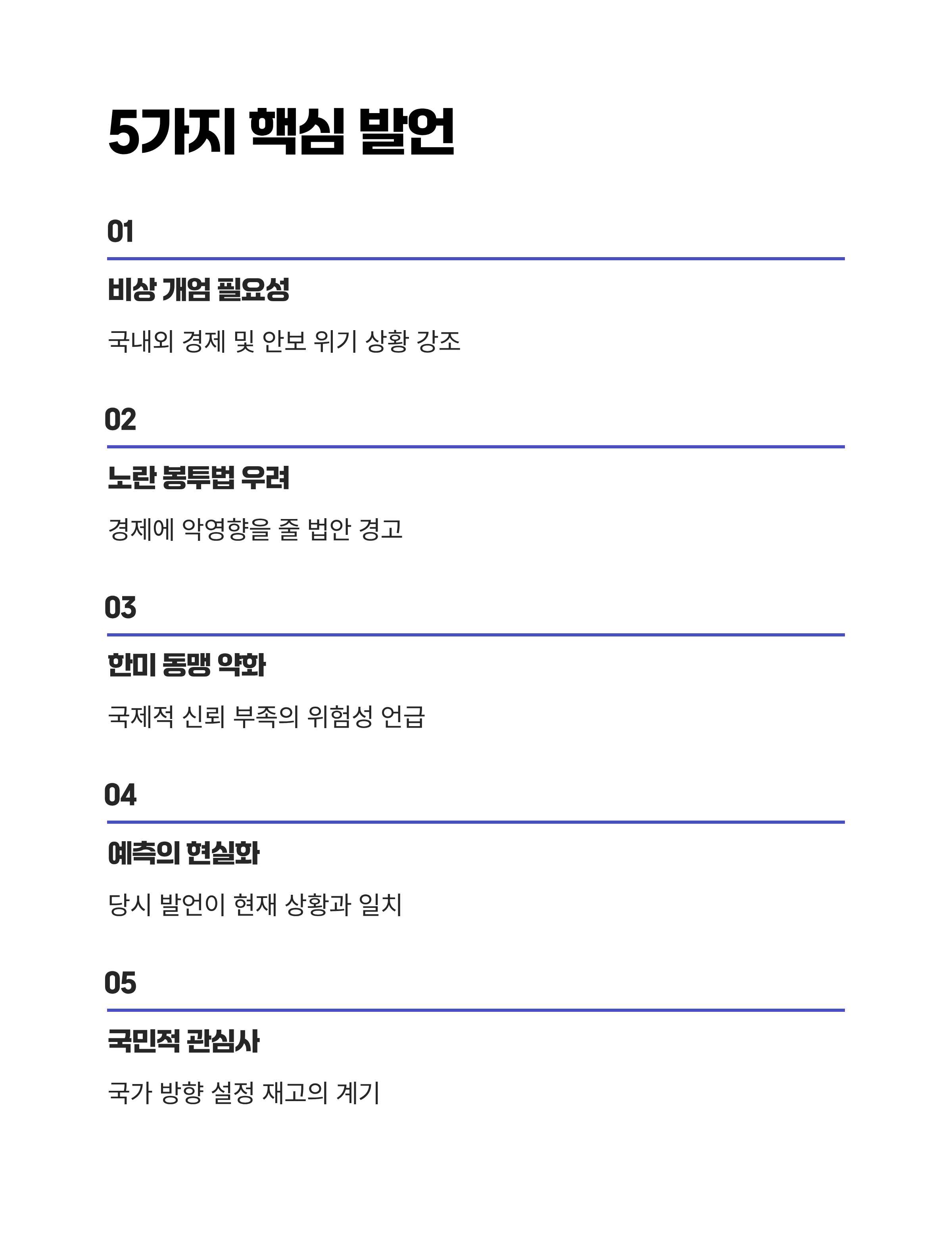 5. 이 발언들은 국민들이 국가적 방향 설정을 재고하는 데 있어 주요 관심사로 작용하고 있습니다.