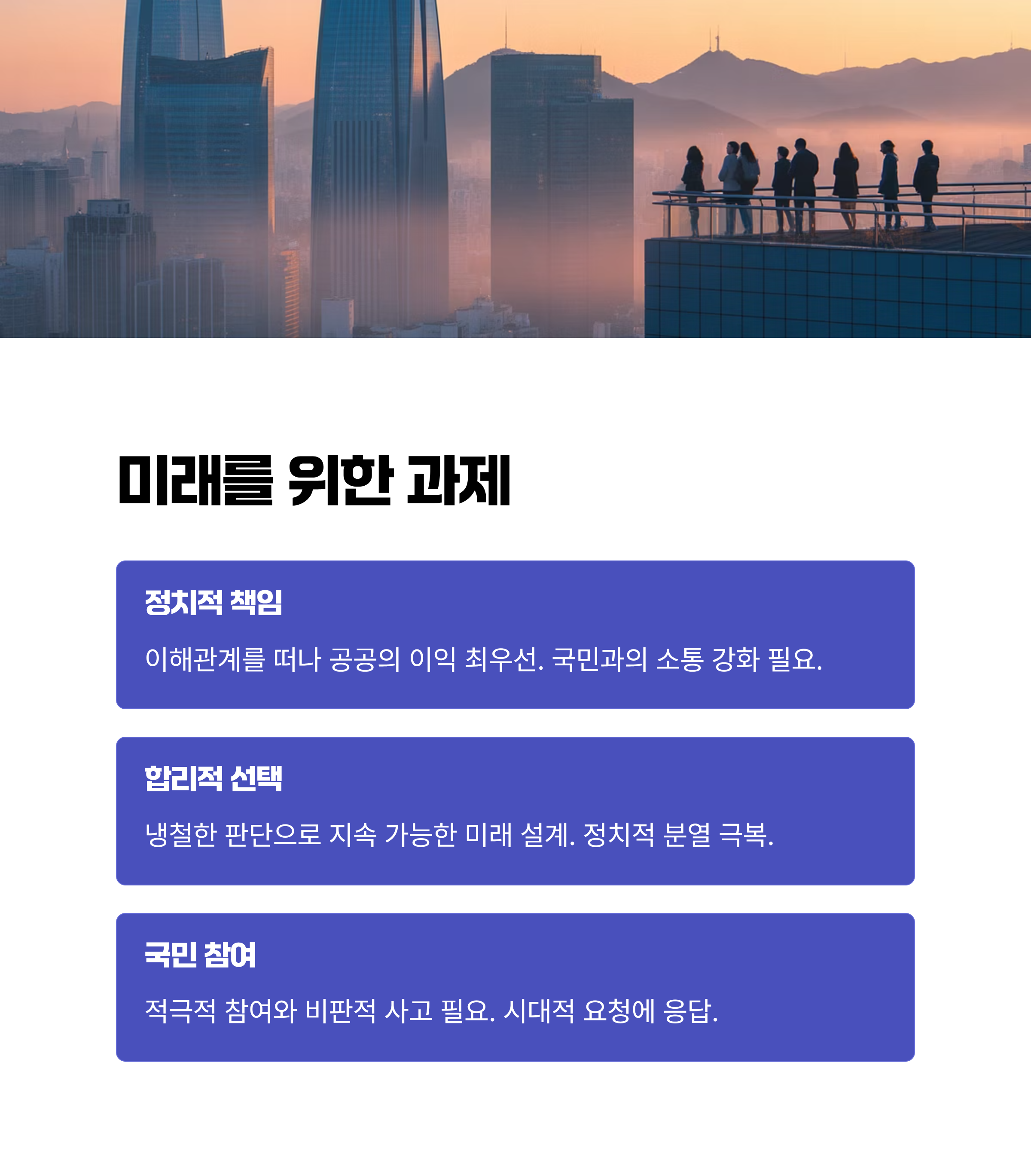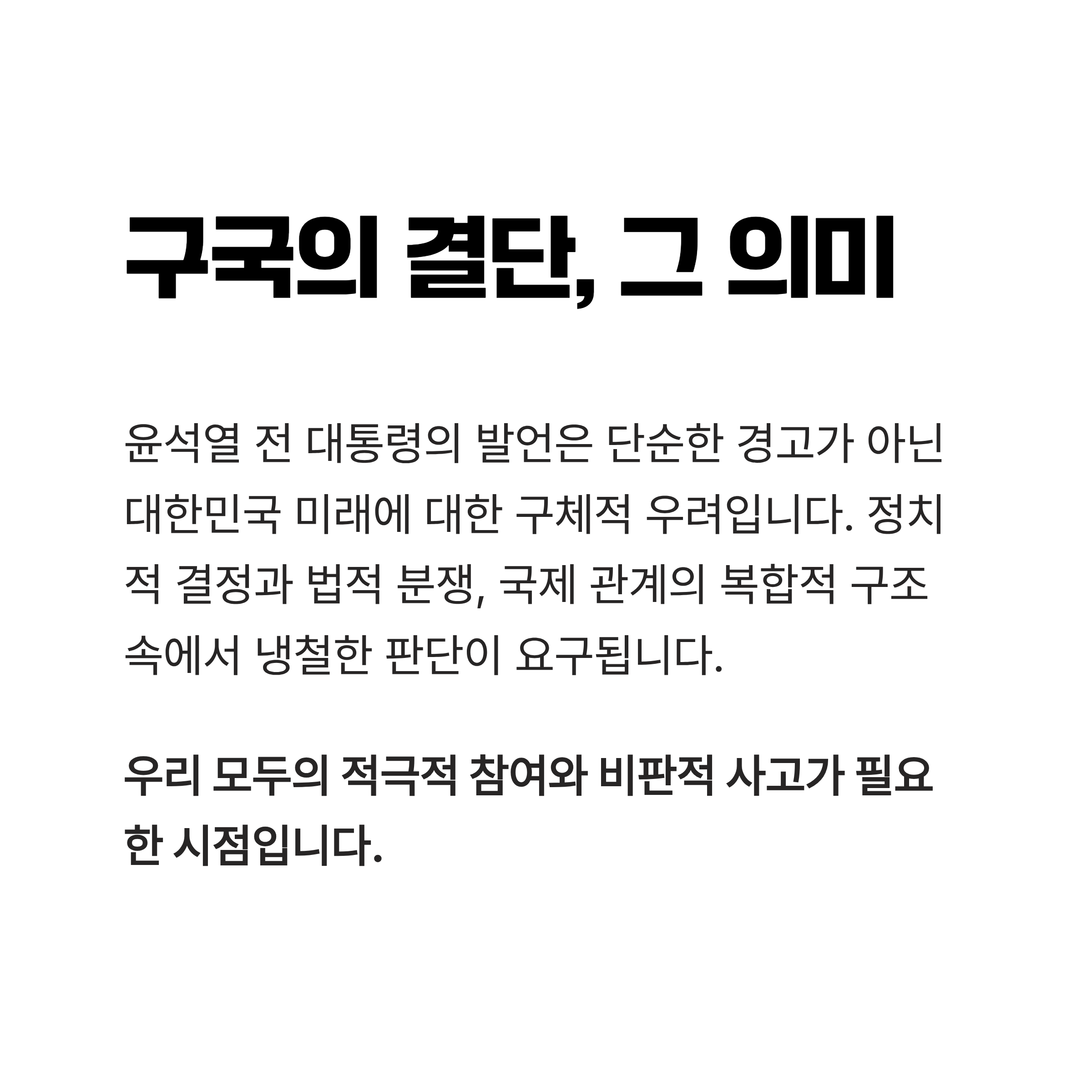 이러한 시대적 요청은 정치인뿐만 아니라 우리 국민 모두의 적극적인 참여와 비판적 사고를 필요로 합니다. 윤 전 대통령이 남긴 '구국의 결단'이라는 표현은 단순히 정치적 구호에 그치지 않고, 우리 사회가 나아가야 할 길에 대해 숙고할 여지를 남겼습니다.
