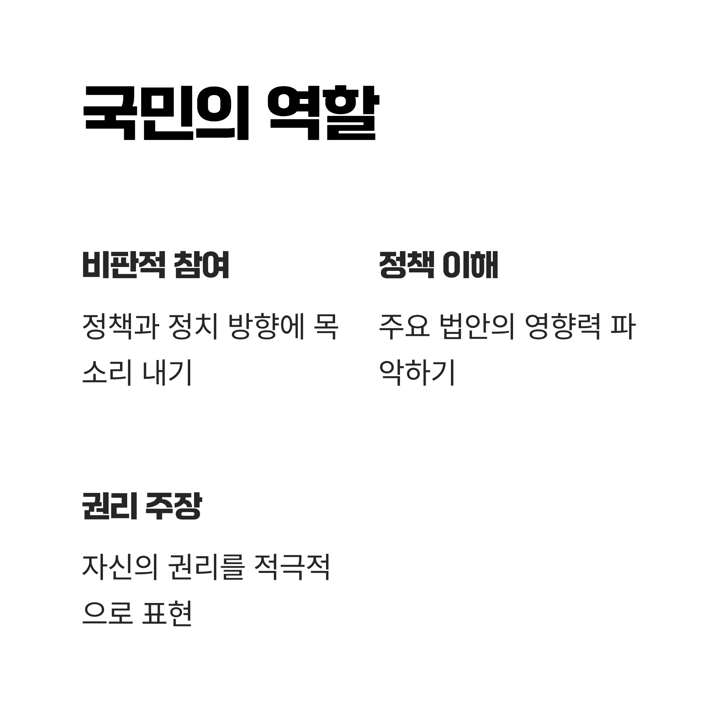A. 국민은 앞으로의 정책과 정치적 방향에 비판적 참여를 통해 목소리를 낼 수 있습니다. 특히, 주요 법안과 정책의 영향력을 이해하고 자신의 권리를 주장하는 태도가 중요합니다. |