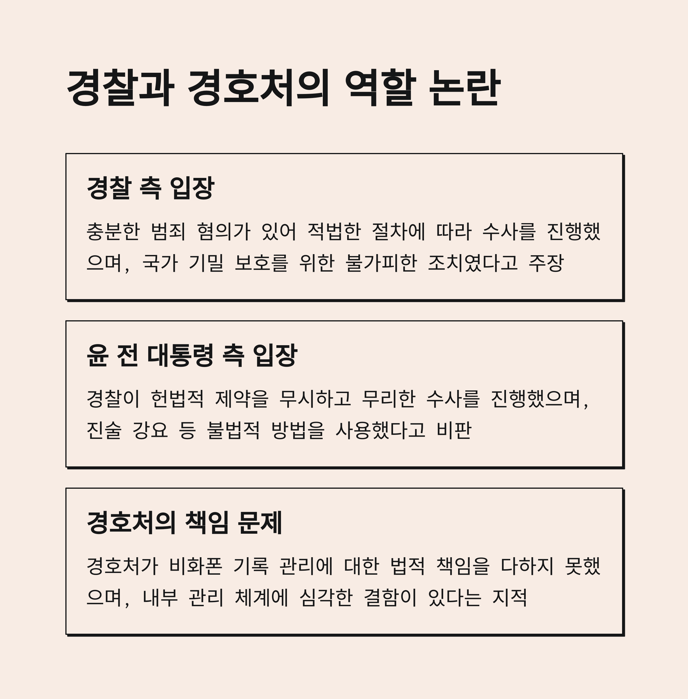 경찰의 수사 과정에서 절차적 위법성이 있었다는 윤 전 대통령 측의 주장은 강한 대립 구도로 이어지고 있습니다. 경호처와 경찰이 비화폰 기록의 확보와 관련한 사전 준비와 법적 적합성을 무시한 채 움직였다는 지적이 있으며, 이는 결국 검찰 조사 결과에 따라 수사 정당성이 판단될 주요 요인이 될 것입니다. 포함된 경찰 관계자들이 강압적 방법이나 진술 강요 혐의를 받은 점 역시 사건의 전개를 복잡하게 만드는 요소로 작용하고 있습니다.