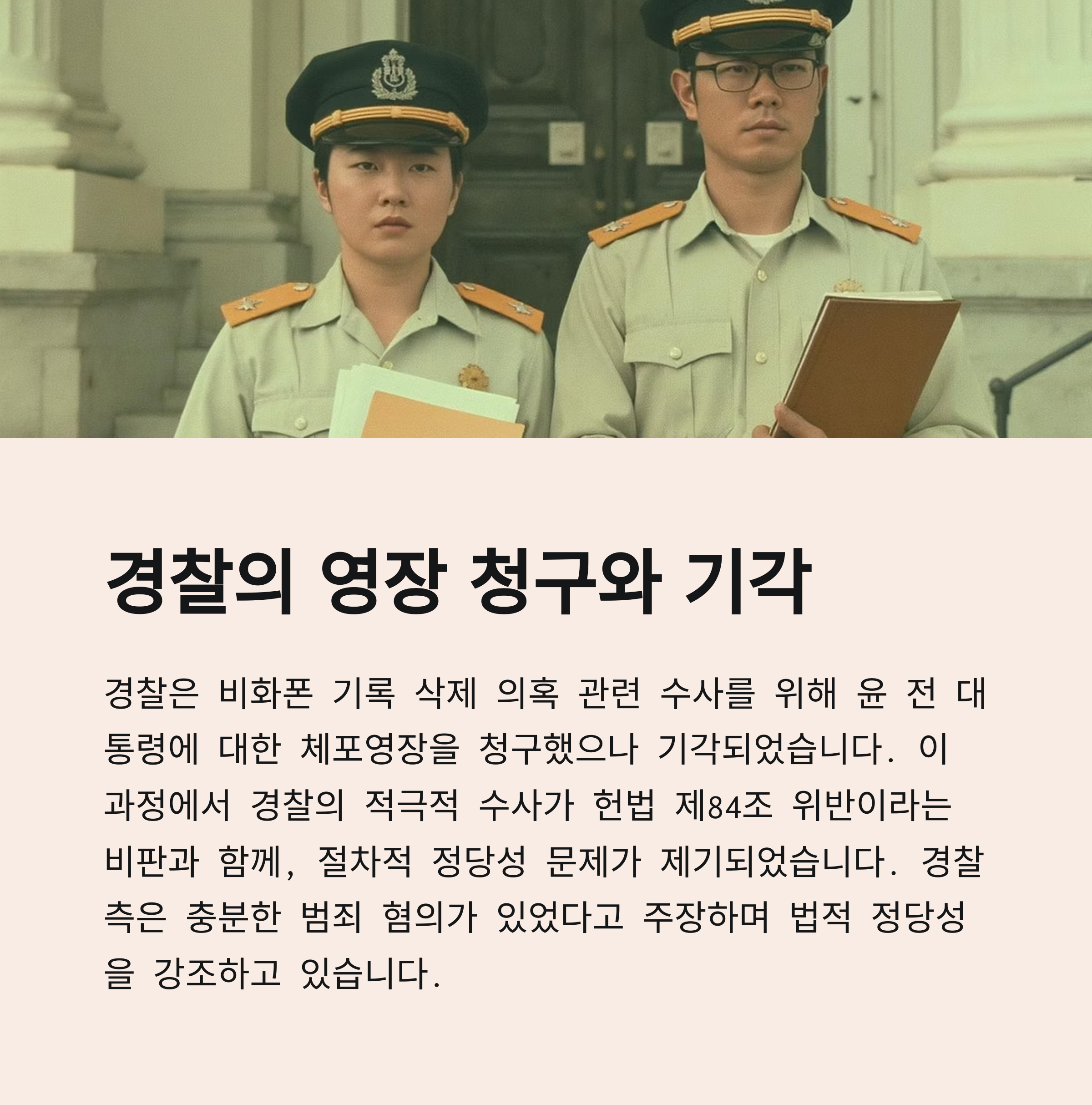 헌법 제84조는 심각한 반역 행위를 제외하고는 전·현직 대통령의 형사소추를 금지하고 있습니다. 이는 행정부 수장을 보호하려는 취지로 만들어진 조항입니다. 그러나 이를 악용한다는 비판도 적지 않습니다. 윤석열 전 대통령 대리인의 주장은 이 조항을 방패로 삼아 사건의 진상 규명을 회피하려는 의도로 비춰질 수 있습니다. 반면, 경찰은 체포영장이 기각된 만큼, 해당 조항을 명확히 초월하지 못했다고 설명합니다. 이 갈등은 곧 헌법적 재해석 필요성까지 확대될 가능성이 있습니다.