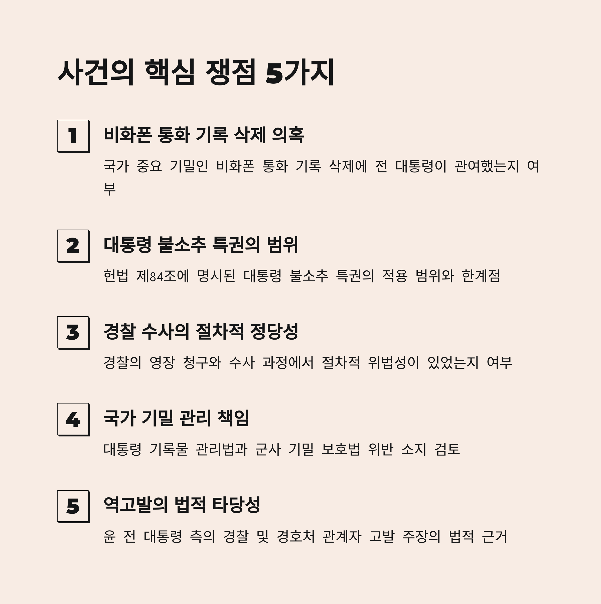 1. 윤석열 전 대통령은 국가 중요 기밀인 비화폰 통화 기록 삭제 의혹에 연루되어 법적, 정치적 논란이 되고 있습니다.