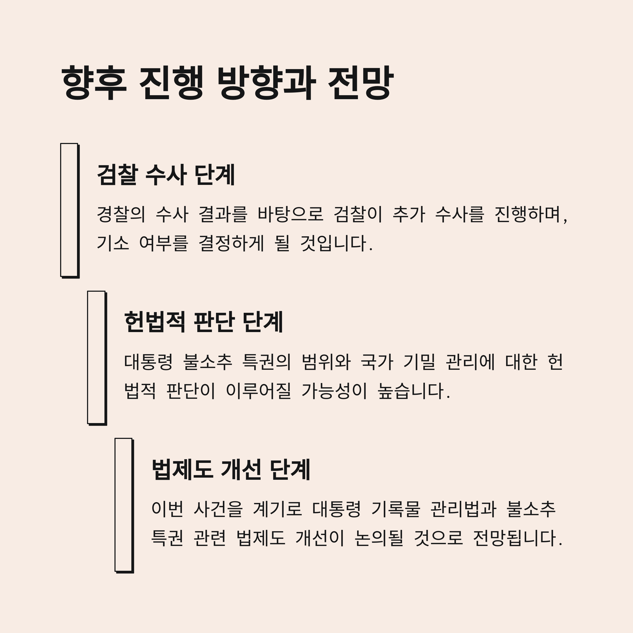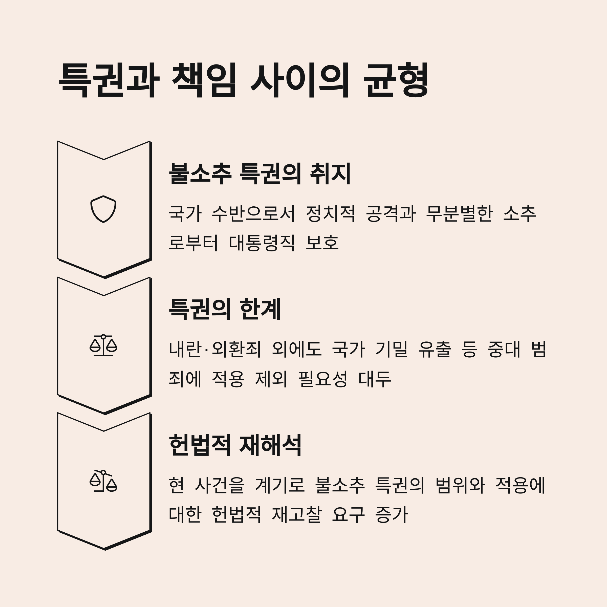 | A. 그렇습니다. 대통령 불소추 특권에 대한 모호성과 이번 사건의 수사 및 법치적 논란은 헌법적 재해석의 필요성을 제기하고 있습니다. 이는 입법부와 사법부 모두에 중요한 의제를 제공할 수 있습니다. |