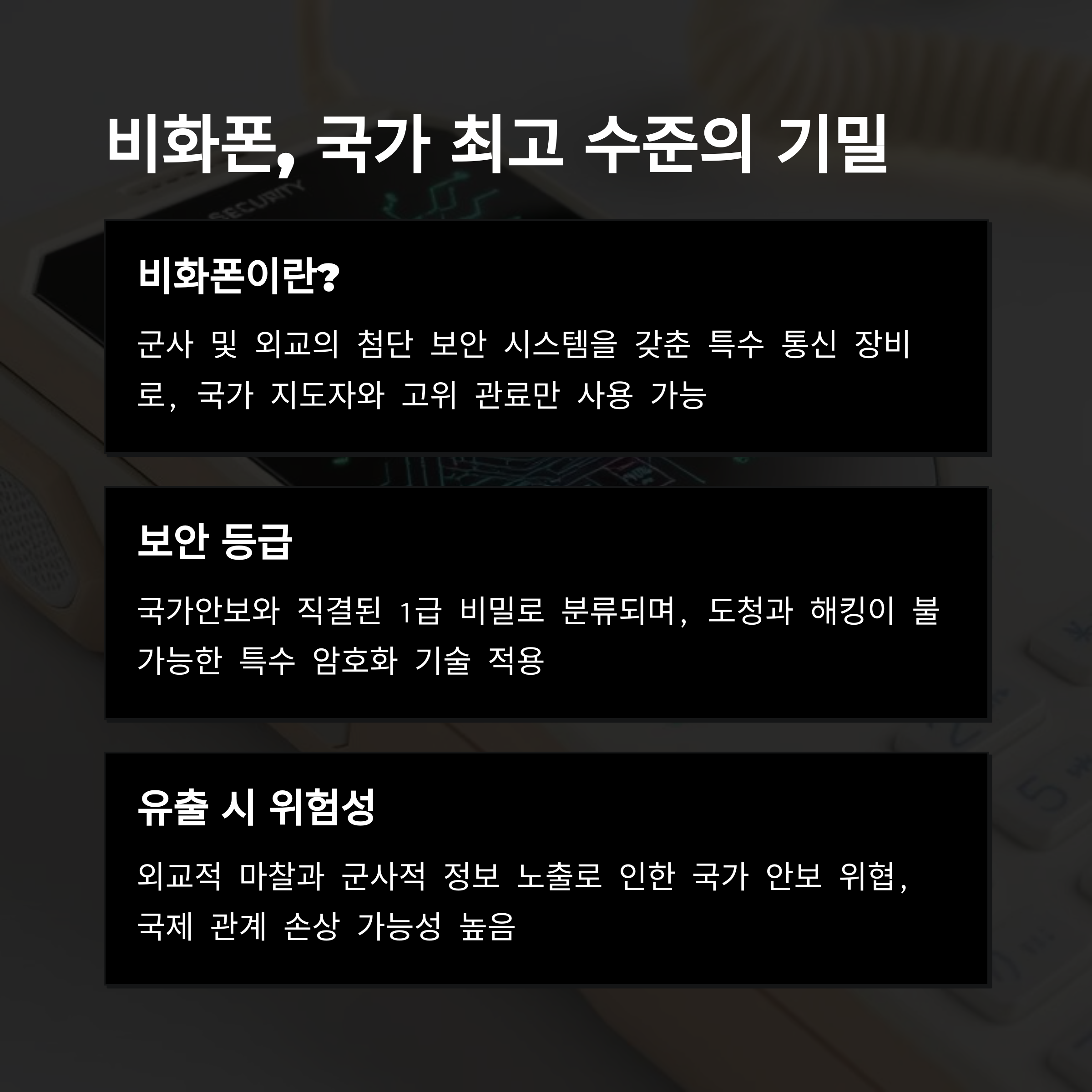 | A. 비화폰 통화 기록은 군사 및 외교의 첨단 보안 시스템으로, 국가안보와 직결된 고급 기밀로 간주됩니다. 이 자료는 유출 시 외교 및 군사적 손해가 발생할 수 있어 법적으로 엄격히 보호받습니다. |
