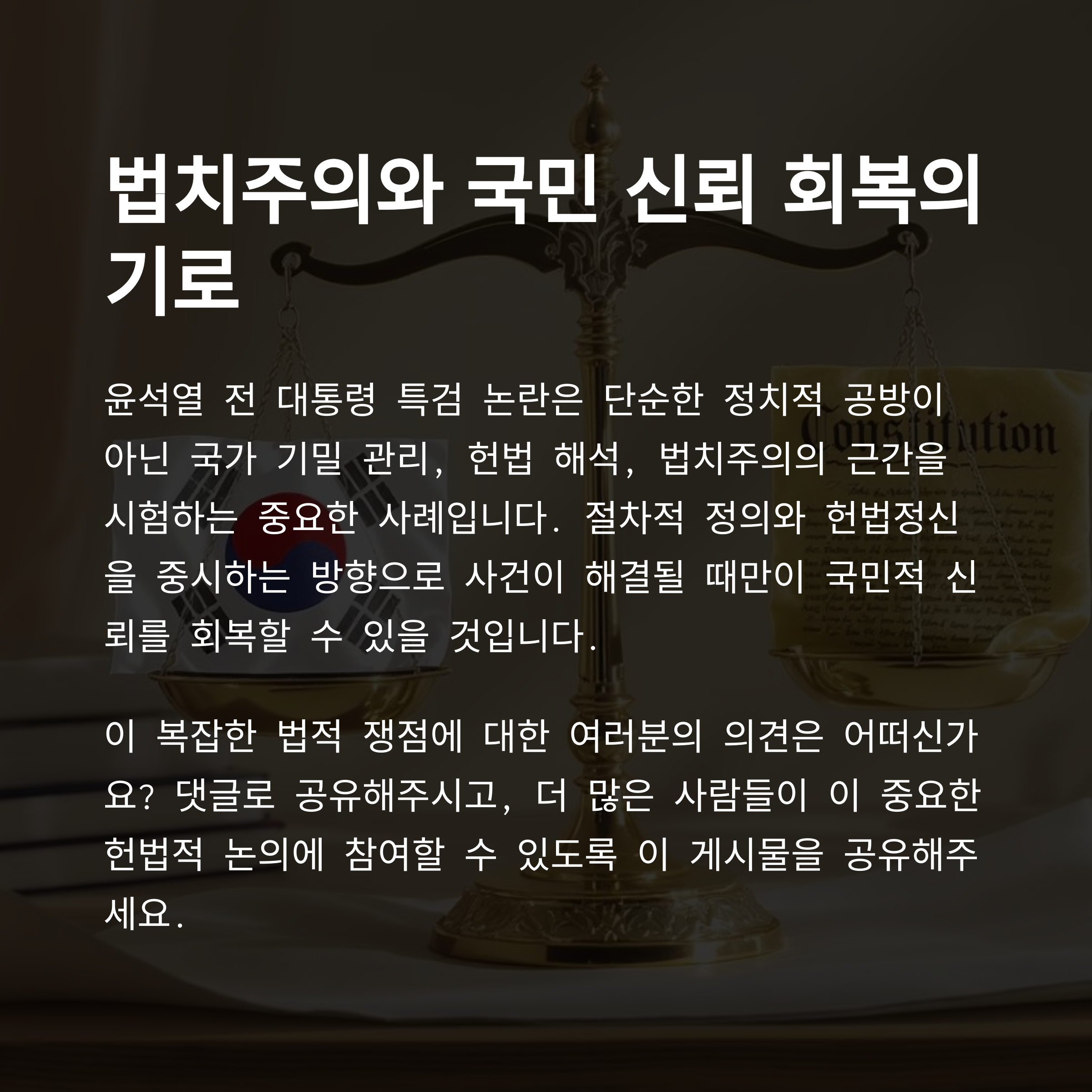 윤석열 전 대통령 관련 사건은 대한민국의 법과 정치 체계를 재조명하는 계기를 제공할 것입니다. 단, 법적 정의가 결코 훼손되지 않도록 주의를 기울여야 합니다.