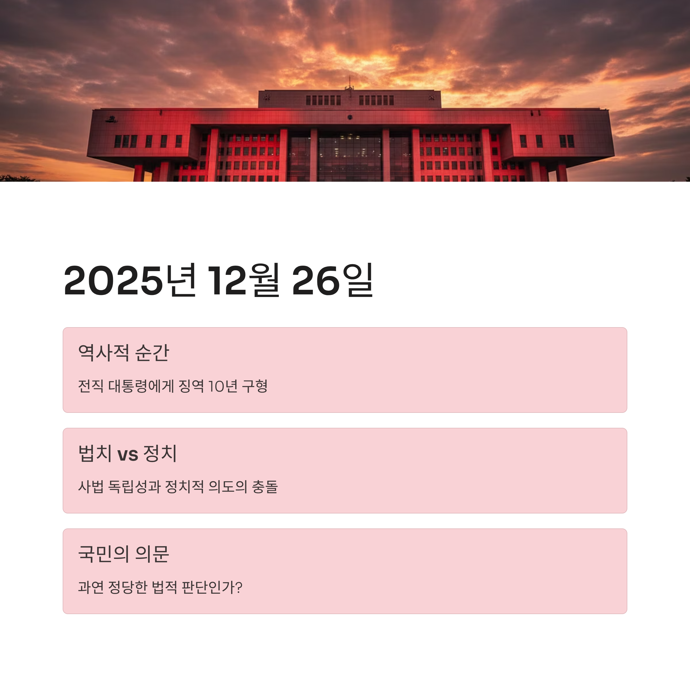 2025년 12월 26일, 대한민국은 역사적으로 매우 이례적인 순간을 맞이했습니다. 특검이 윤석열 전 대통령에게 징역 10년을 구형하며 이 사건은 법치주의와 정치적 독립성이 충돌한 대표적 사례로 떠오르고 있습니다. 특검은 징역 10년을 선고하려는 이유로, 다양하고 모호한 혐의들을 조합하며 의도적으로 형벌을 합산한 듯한 인상을 주고 있습니다. 이는 단지 법적 판단을 넘어선 정치적 메시지라는 분석이 많습니다. 특히, 이번 사건에 대한 여론은 법적 정당성과 정치적 중립성을 넘어선 특검의 지나친 행보로 갈리고 있으며, 이는 민주주의 및 법치주의의 근간을 흔드는 논란으로 확산되고 있습니다.