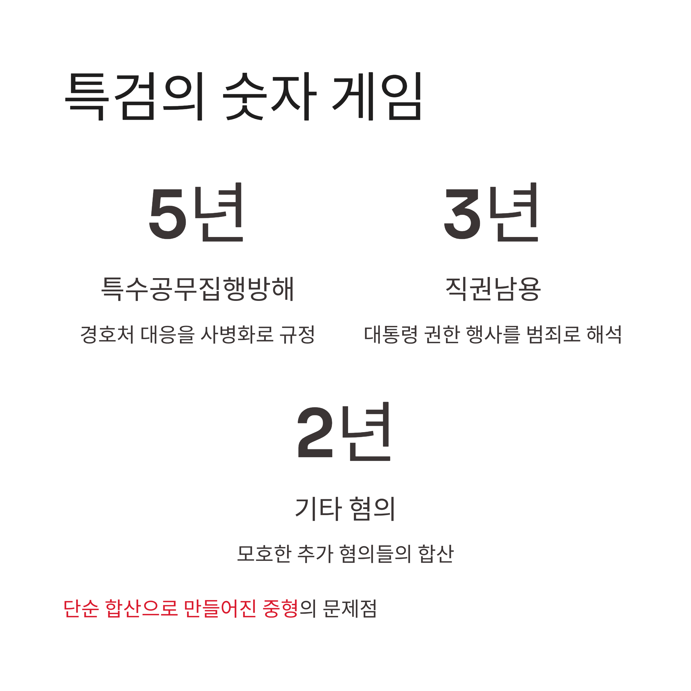 1. 특검은 '특수공무집행방해 5년, 직권남용 3년, 기타 혐의 2년'을 기계적으로 합산하여 징역 10년을 구형했습니다.