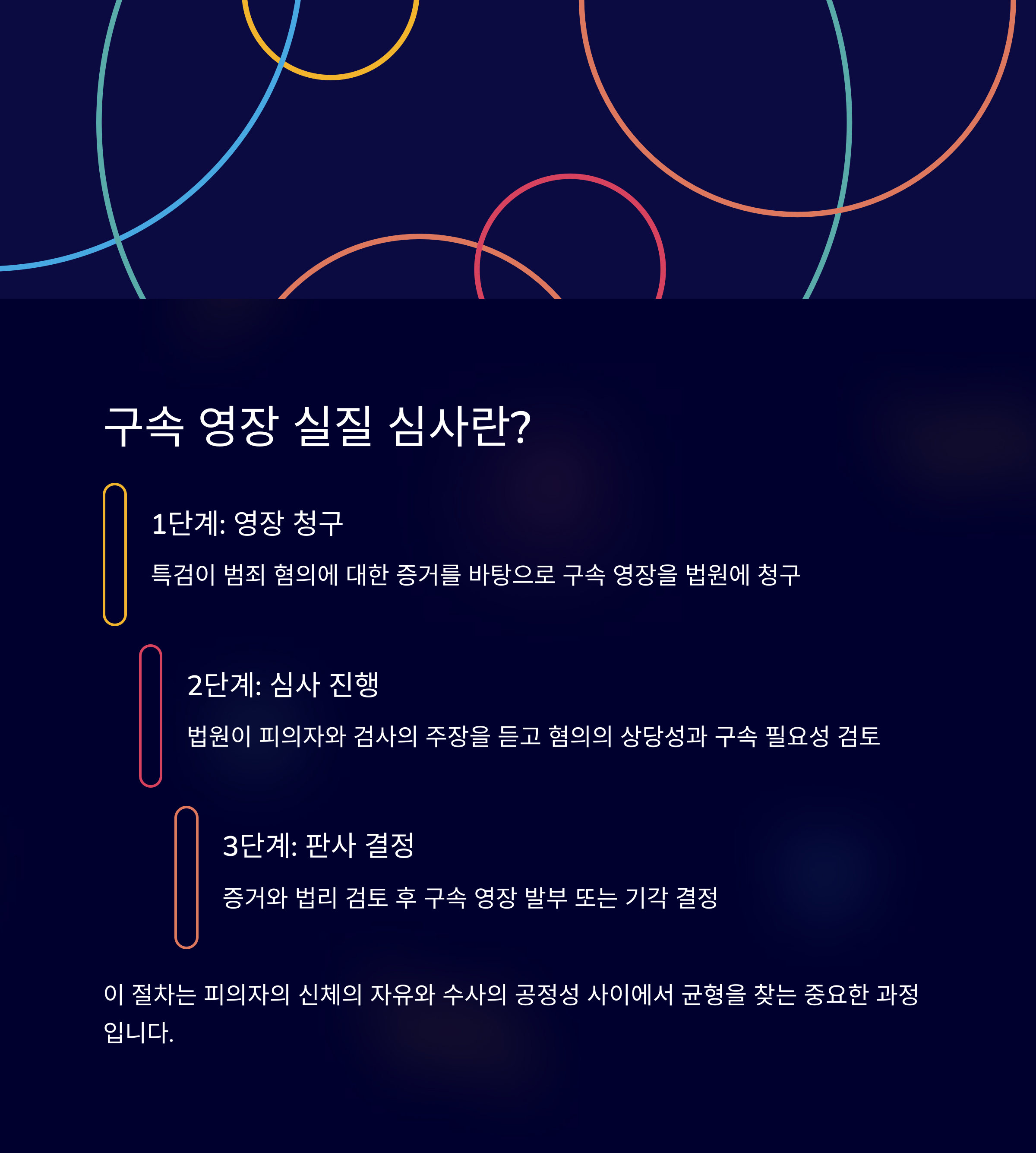 | A. 구속 영장 실질 심사는 법원이 검찰 측의 증거와 피의자 방어 측의 논리를 확인하며, 구속의 필요성과 법적 근거를 검토하는 단계입니다. |