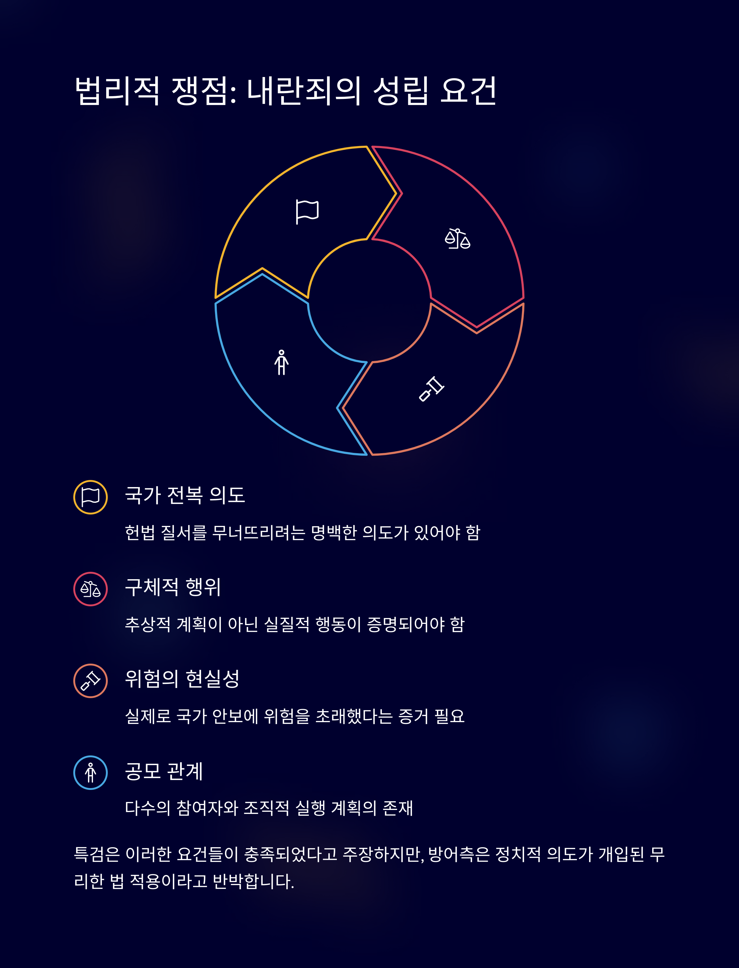 | A. 내란 혐의는 헌법질서 및 국가체제를 전복하거나 이를 시도하려는 행위에 대해 적용됩니다. 이는 법적 심사의 경우, 증거와 의도 중심으로 판단됩니다. |