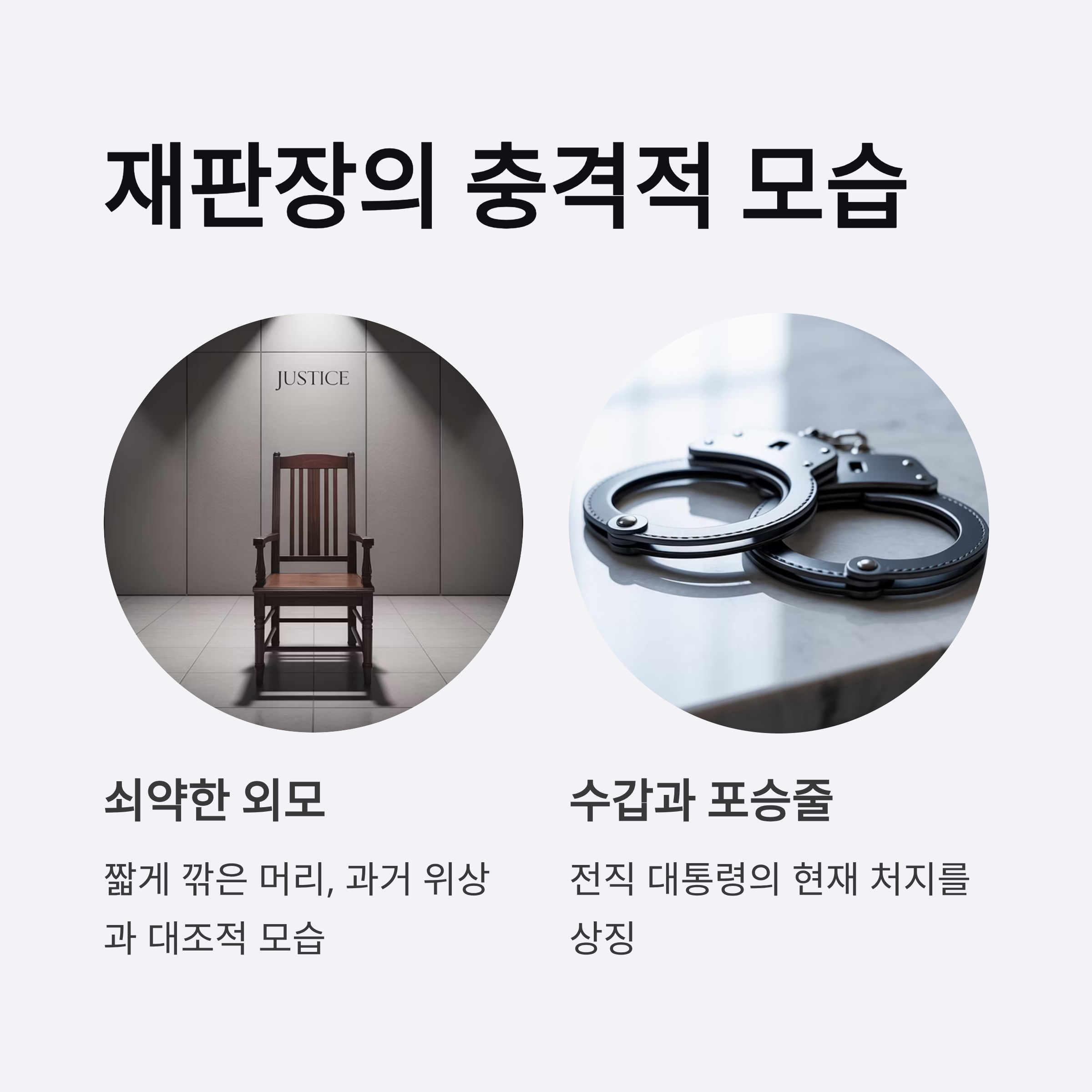 재판장에서는 그의 쇠약해진 외모와 수갑, 포승줄까지 동원된 모습이 공개되었습니다.