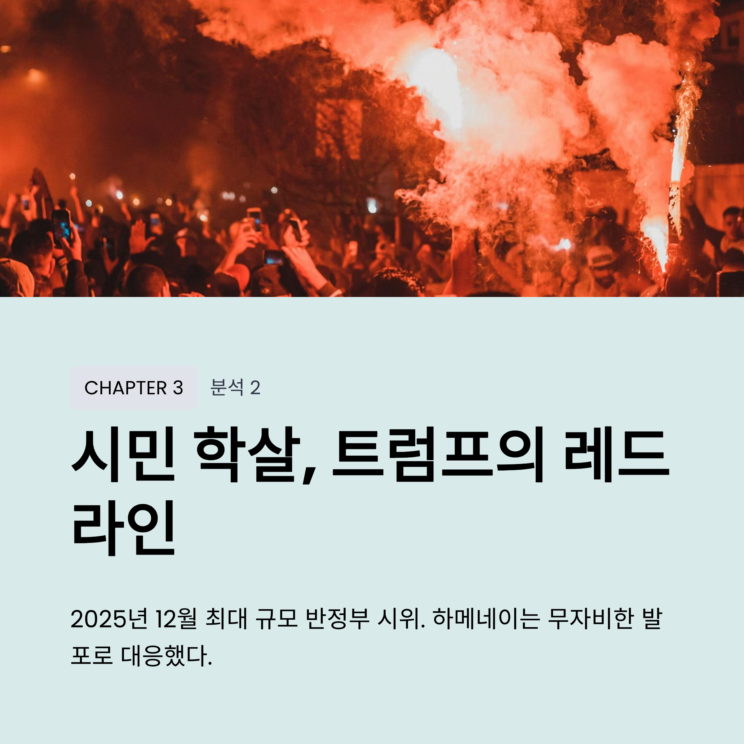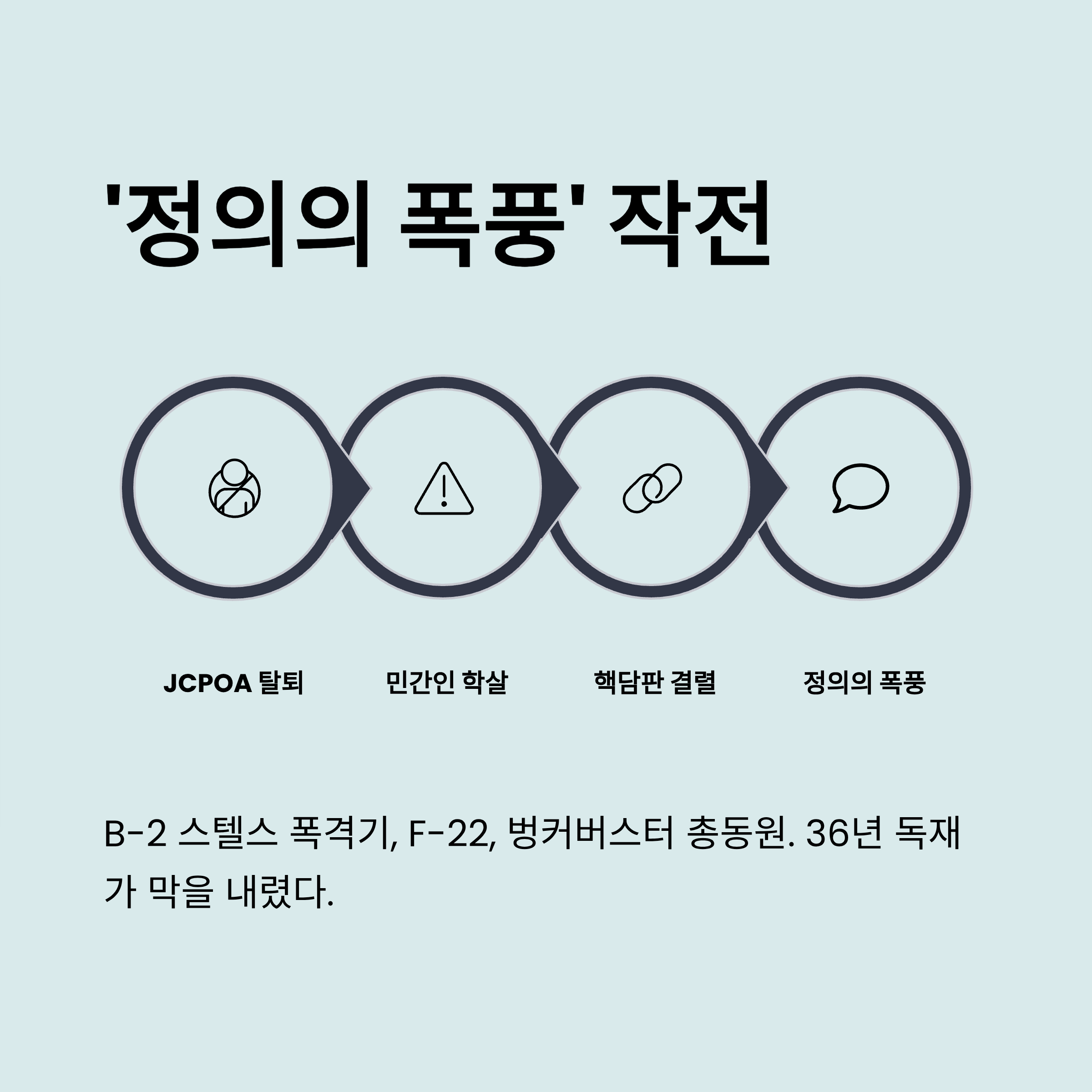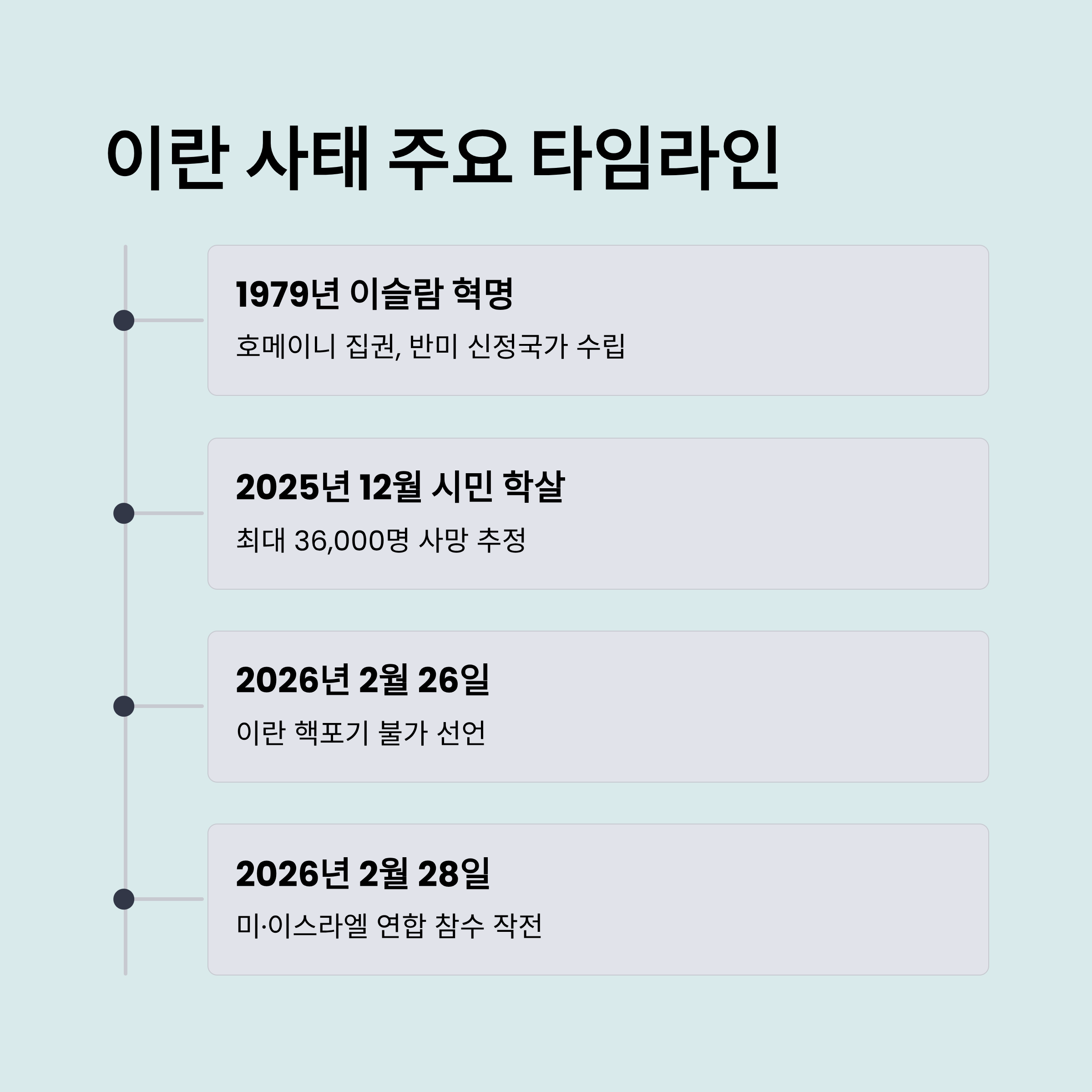 미국·이스라엘 참수 작전 배경: 트럼프 행정부의 핵협정 탈퇴와 제재 강화 속에서 이란은 핵개발을 지속했습니다. 결정적으로 2025년 반정부 시위에서 최대 3만 6천 명의 시민이 학살당하고, 2026년 핵협상마저 결렬되자 미국은 군사 작전을 감행했습니다.