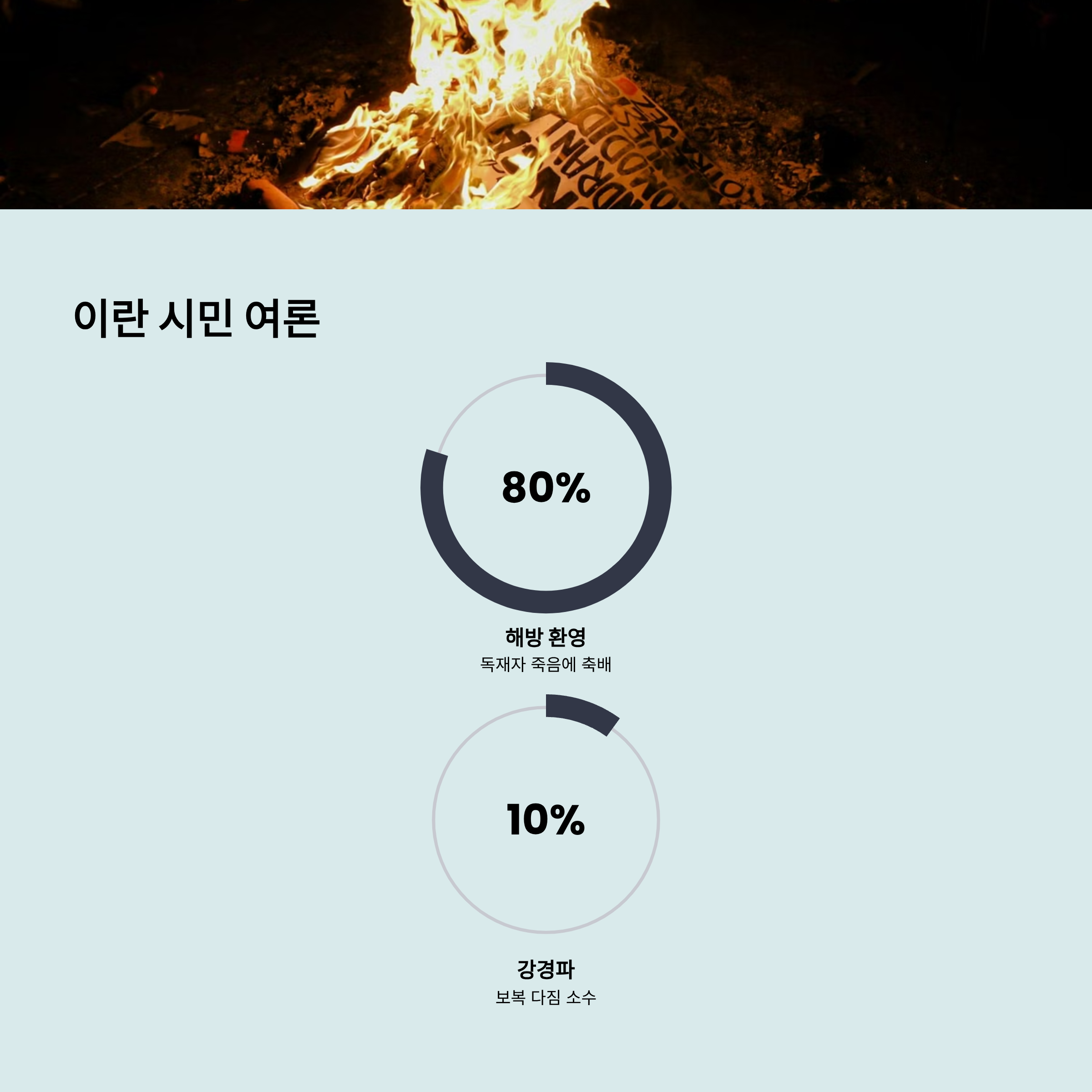 | A. 외신과 SNS 분석에 따르면, 하메네이를 지지하며 보복을 다짐하는 강경파 여론은 10% 초반에 불과합니다. 반면 대다수인 70~80%의 시민들은 독재자의 죽음을 환영하며 거리로 나와 춤을 추고 축배를 드는 등 해방감을 만끽하고 있는 것으로 전해집니다. |