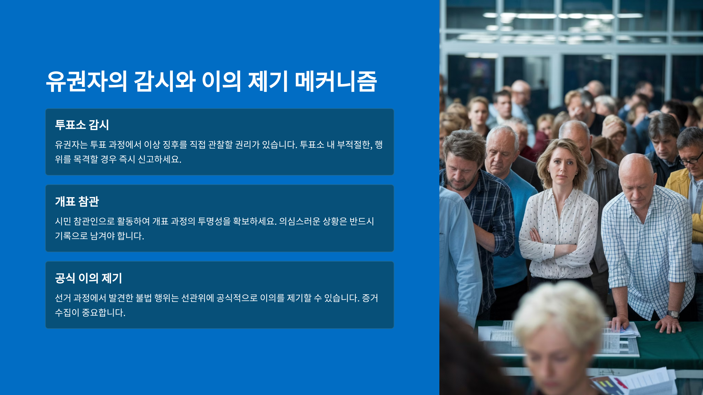 - 이 과정에서 유권자는 이의 제기를 통해 부정을 감시하고 제동을 걸 수 있다.