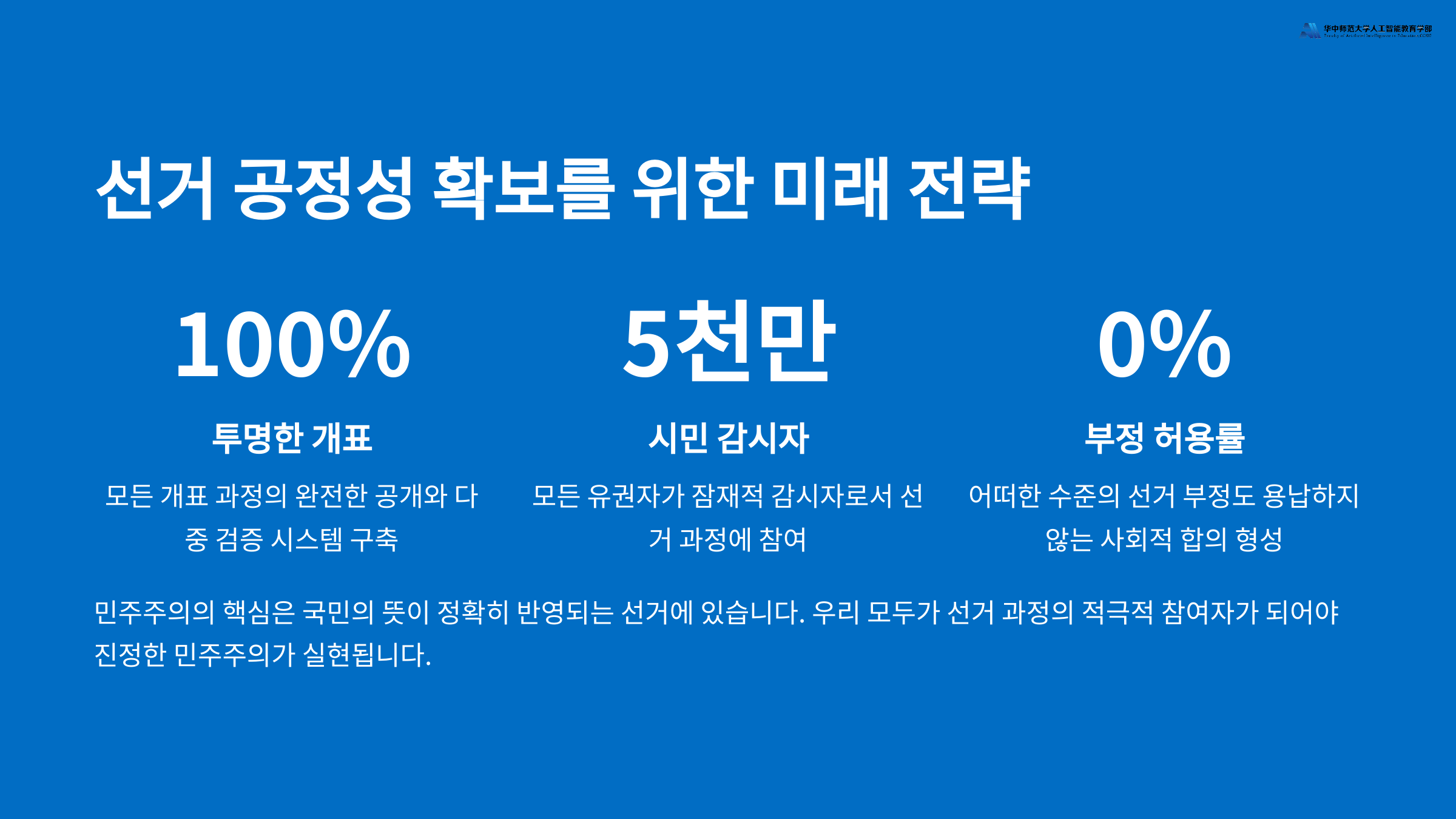 기존 제도 하에서는 부정선거 방지를 위한 법적·행정적 접근이 어렵다. 국민 감시와 이의 제기, 그리고 대중 참여를 통해 구조적 허점을 공략해야 한다. 부여 등 일부 지역 사례를 통해 현장 대응의 중요성이 입증되었다. 이봉규TV, 팔로우더파티 등 다양한 시민 플랫폼이 전략적 행동을 제안하고 있으며, 대중적 공감대를 얻고 있다. 미국의 선거 시스템 등 해외 사례를 참조하여 보다 정교한 대응 방안이 마련될 필요가 있다.