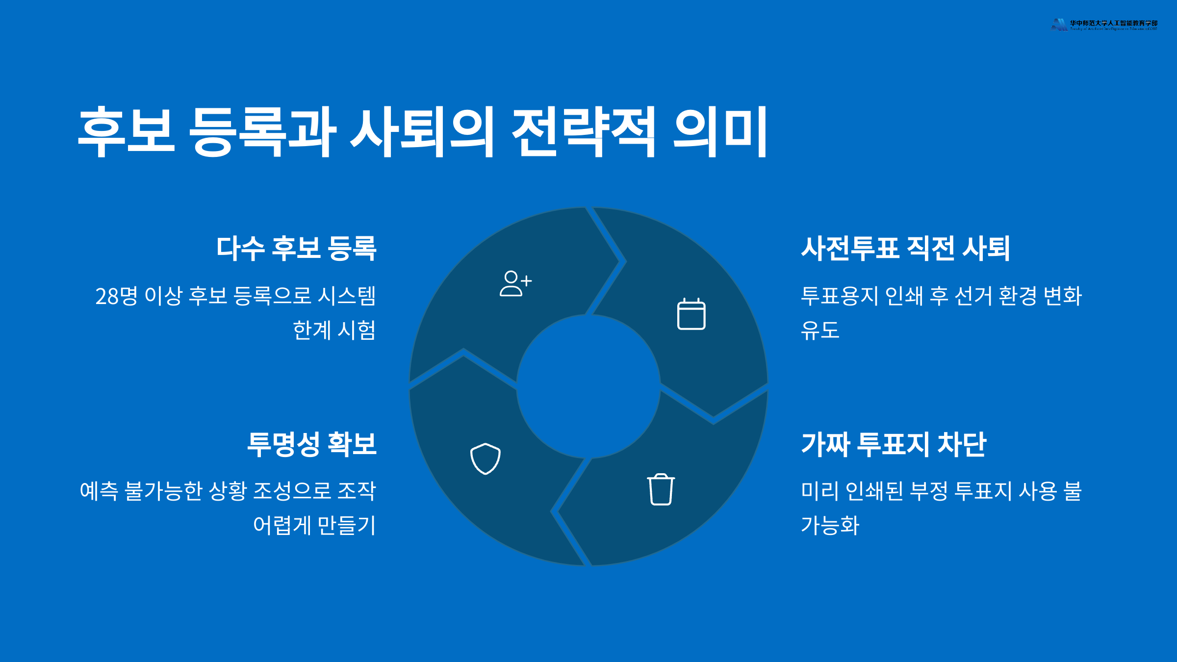 사전투표 전 후보가 사퇴하면, 인쇄된 투표지와 실제 상황이 달라지게 된다. 이 경우 선관위는 재인쇄가 불가능하므로 가짜 투표지 배포를 차단하는 효과가 발생한다. 전략적 후보 등록은 실제 득표 활동이 아닌 등록 자체를 통한 부정 방지 수단으로 기능한다. 예를 들어 28명 이상이 등록 후 사퇴하거나 표기 오류를 유도하면 분류기 작동 자체가 불가능하다. 등록비 3억 원을 필요로 하지만, 이 금액을 ‘대한민국의 미래에 대한 투자’로 보는 의견도 많다.