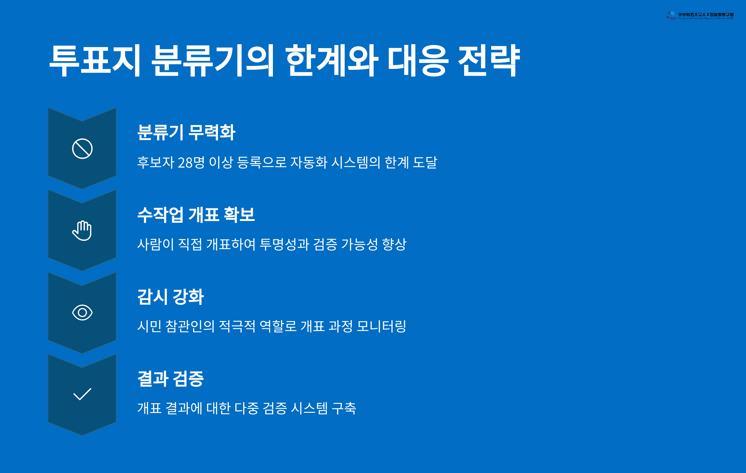 투표지 길이가 50cm를 넘거나 접힌 상태일 경우, 분류기가 이를 인식하지 못하게 된다. 후보 수가 많을 경우 투표지가 길어지므로 분류기 사용 자체가 불가능해진다. 전자계표기와 분류기 모두 일정 조건 이상일 경우 기술적으로 작동하지 않으며, 이는 수작업 개표를 강제한다. 이렇게 되면 조작된 투표지를 대량 생산하거나 배치하는 일이 어렵게 된다. 과거 투표소 소송 사례를 통해, 조작된 투표지가 다수 발견되었음에도 열람이 거부된 바 있다. 이는 기술보다 제도적 감시가 필요하다는 방증이다.