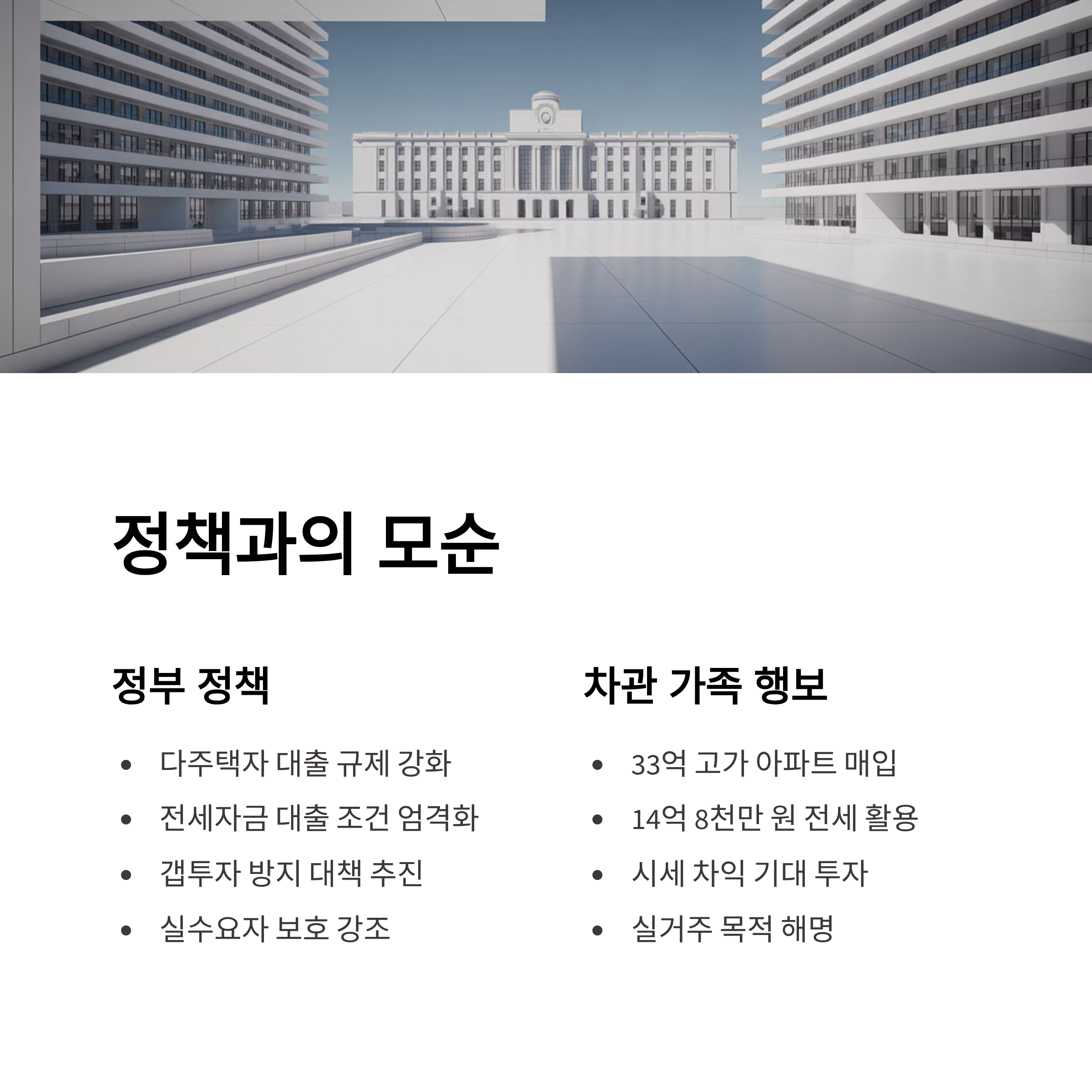 이상경 차관의 배우자가 실거주 목적이라고 해명한 아파트 매입은, 높은 전세 비율(14억 8천만 원을 포함한 33억 원 규모)로 인해 실상 갭투자로 인식되고 있습니다. 이는 부동산 가격 상승으로 시세 차익을 노린 행위로 해석되며, 현 정부의 부동산 정책 취지와 충돌합니다. 이는 소유권 투자와 정책 입안 관점에서 공직자의 도덕성 문제가 맞물려 강한 여론의 반발을 불러일으켰습니다.