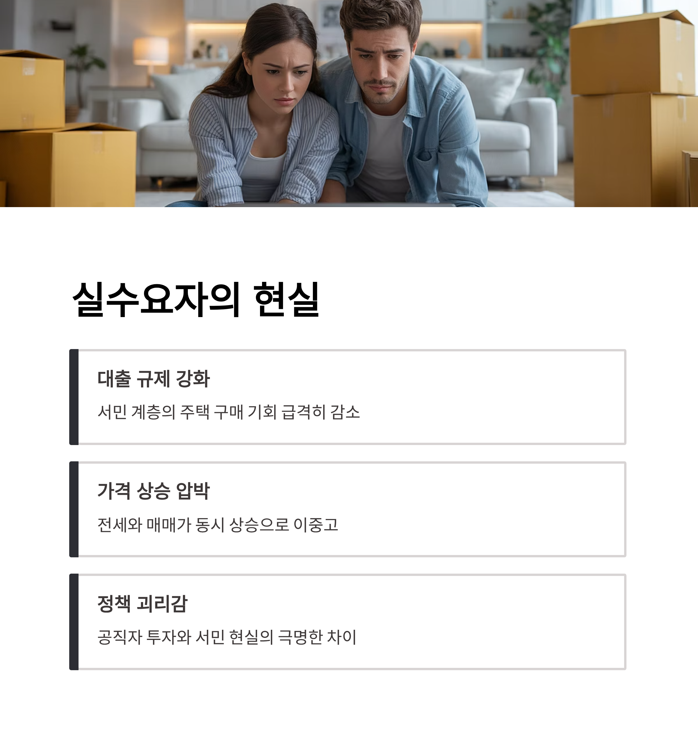실수요자들에게 주택은 단순한 투자 수단이 아니라 생활과 직결된 필수 재화입니다. 이번 사태는 정부가 기존의 강력한 규제 기조를 밀어붙이면서도 소득수준이 낮거나 대출 제한을 받는 서민 계층에 대한 배려가 부족했음을 보여줍니다. 이는 다수의 국민들이 느끼는 피해 의식과 큰 불만으로 작용하고 있습니다.