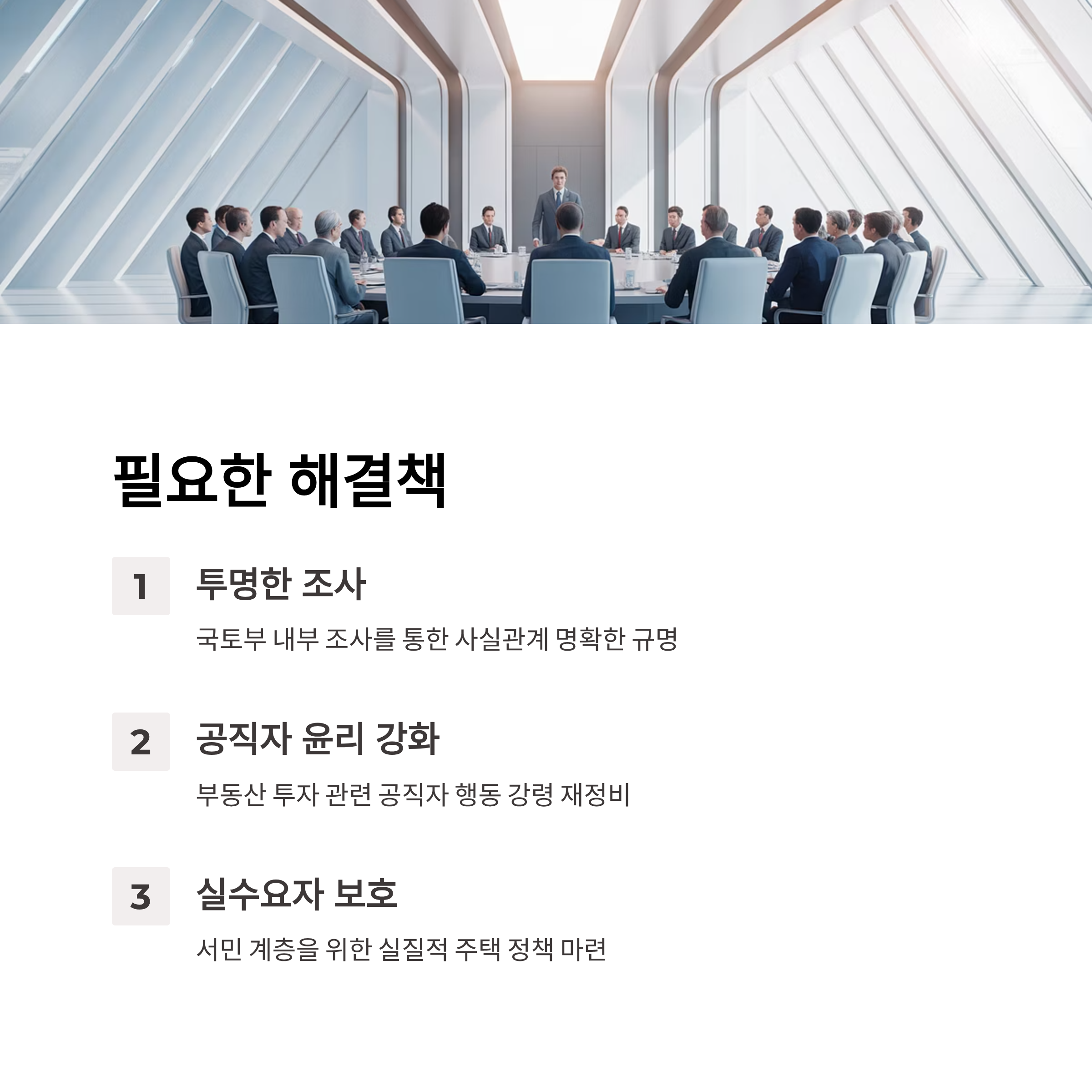 5. 배우자의 구입 행위 배경을 둘러싼 팩트 검증이 필요하며, 국토부 내부 조사 진행 여부가 주목됩니다.
